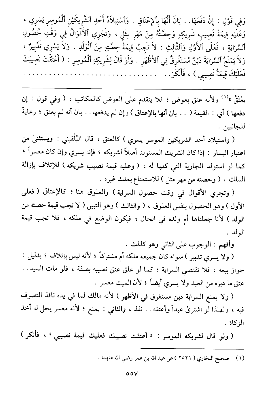 (واستيلاد أحد الشريكين الموسر يسري) كالعتق، قال البُلْقيني: ويستثنى من اعتبار اليسار: إذا كان الشريك المستولد أصلًا لشريكه؛ فإنه يسري وإن كان معسرًا؛ كما لو استولد الجارية التي كلها له، (وعليه قيمة نصيب شريكه) للإتلاف بإزالة الملك، (وحصته من مهر مثل) للاستمتاع بملك غيره.