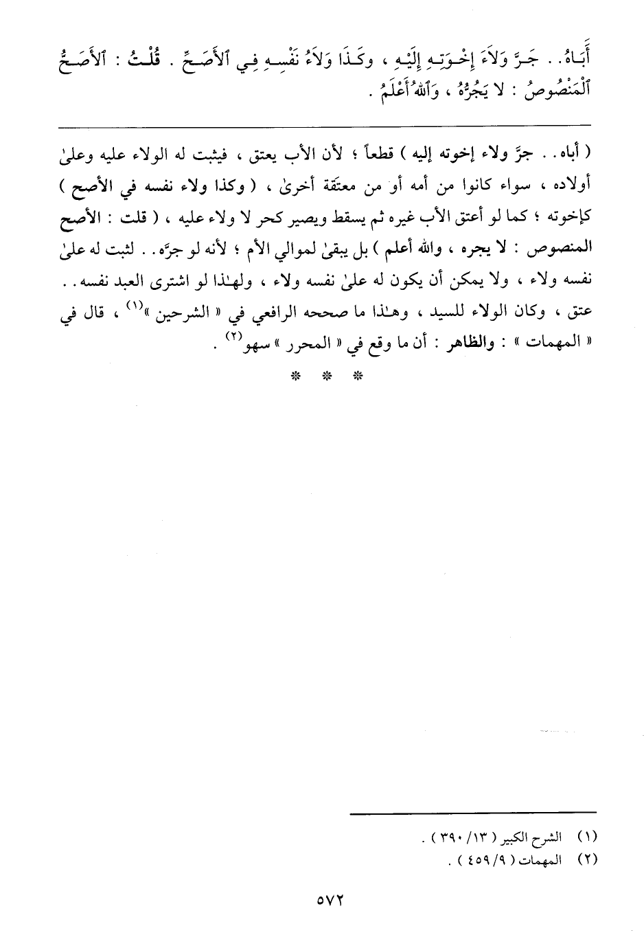 (أباه .. جرَّ ولاء إخوته إليه) قطعًا؛ لأن الأب يعتق، فيثبت له الولاء عليه وعلى أولاده، سواء كانوا من أمه أو من معتَقة أخرى، (وكذا ولاء نفسه في الأصح) كإخوته؛ كما لو أعتق الأب غيره ثم يسقط ويصير كحر لا ولاء عليه، (قلت: الأصح المنصوص: لا يجره، والله أعلم) بل يبقى لموالي الأم؛ لأنه لو جرَّه .. لثبت له على نفسه ولاء، ولا يمكن أن يكون له على نفسه ولاء، ولهذا لو اشترى العبد نفسه .. عتق، وكان الولاء للسيد، وهذا ما صححه الرافعي في "الشرحين" (١)، قال في "المهمات": والظاهر: أن ما وقع في "المحرر" سهو (٢).