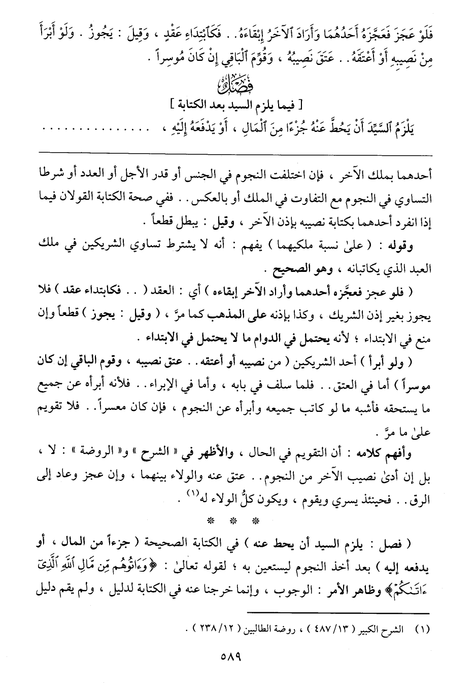 (فصل: يلزم السيد أن يحط عنه) في الكتابة الصحيحة (جزءًا من المال، أو يدفعه إليه) بعد أخذ النجوم ليستعين به؛ لقوله تعالى: {وَآتُوهُمْ مِنْ مَالِ اللَّهِ الَّذِي آتَاكُمْ} وظاهر الأمر: الوجوب، وإنما خرجنا عنه في الكتابة لدليل، ولم يقم دليل