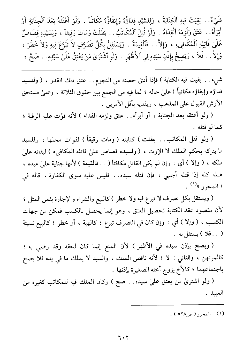 (ويستقل بكل تصرف لا تبرع فيه ولا خطر) كالبيع والشراء والإجارة بثمن المثل؛ لأن مقصود عقد الكتابة تحصيل العتق، وهو إنما يحصل بالكسب فمكن من جهات الكسب، (وإلا) أي: وإن كان في التصرف تبرع؛ كالهبة، أو خطر؛ كالبيع نسيئة (. . فلا) يستقل به.