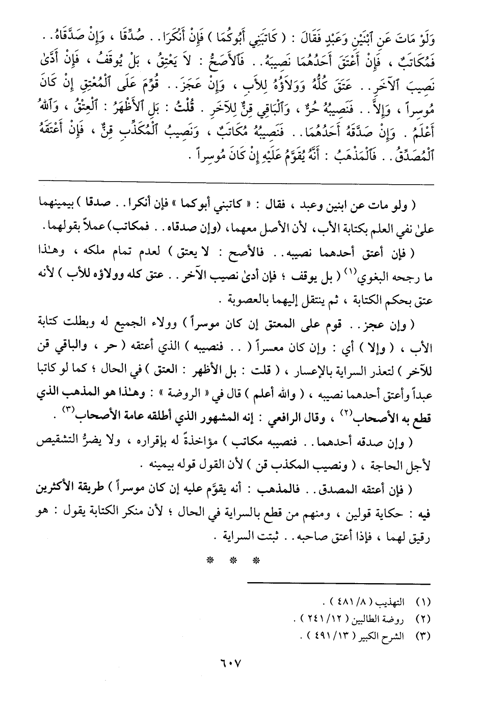 (فإن أعتقه المصدق. . فالمذهب: أنه يقوَّم علبه إن كان موسرًا) طريقة الأكثرين فيه: حكاية قولين، ومنهم من قطع بالسراية في الحال، لأن منكر الكتابة يقول: هو رقيق لهما، فإذا أعتق صاحبه. . ثبتت السراية.