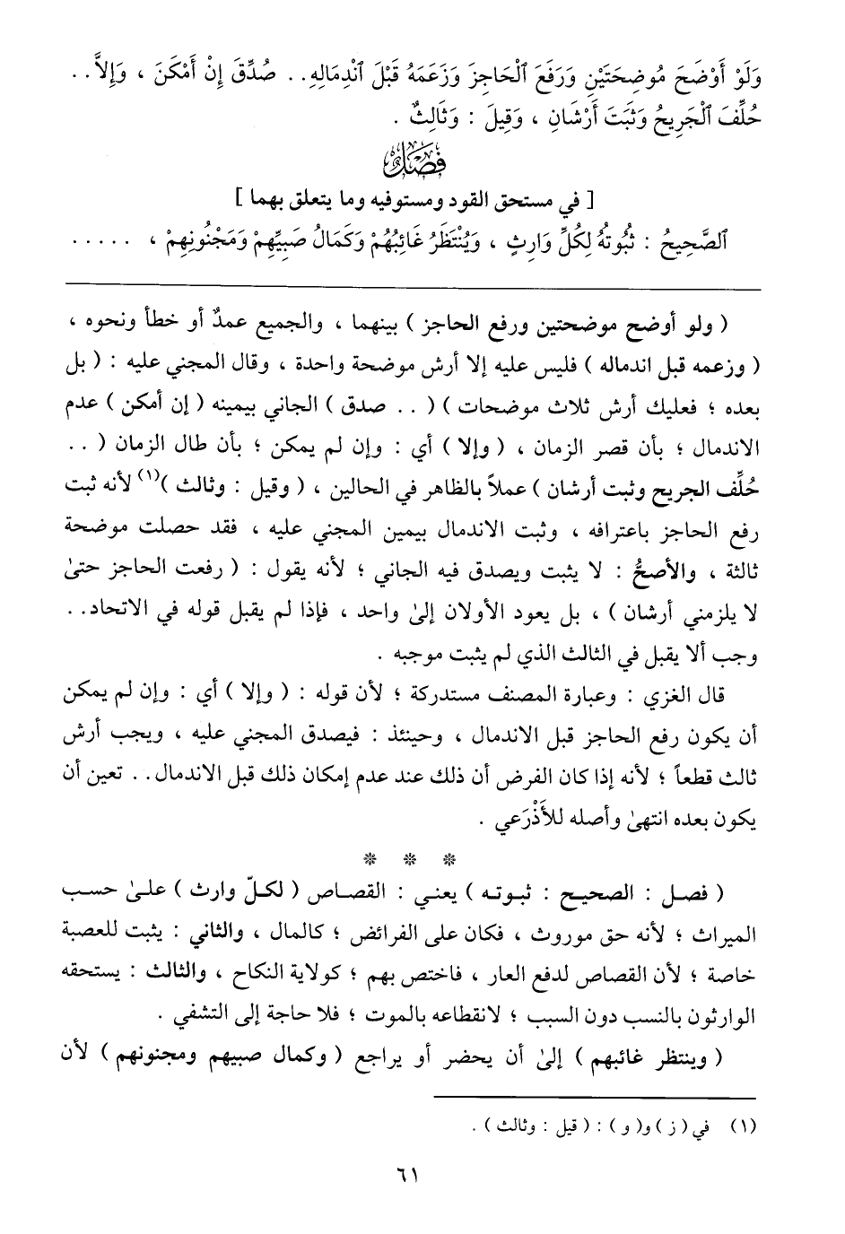(ولو أوضح موضحتين ورفع الحاجز) بينهما، والجميع عمدٌ أو خطأ ونحوه، (وزعمه قبل اندماله) فليس عليه إلا أرش موضحة واحدة، وقال المجني عليه: (بل بعده؛ فعليك أرش ثلاث موضحات ( .. صدق) الجاني بيمينه (إن أمكن) عدم الاندمال، بأن قصر الزمان، (وإلا) أي: وإن لم يمكن، بأن طال الزمان) .. حُلِّف الجريح وثبت أرشان) عملًا بالظاهر في الحالين، (وقيل: وثالث) (١) لأنه ثبت رفع الحاجز باعترافه، وثبت الاندمال بيمين المجني عليه، فقد حصلت موضحة ثالثة، والأصحُّ: لا يثبت ويصدق فيه الجاني؛ لأنه يقول: (رفعت الحاجز حتى لا يلزمني أرشان)، بل يعود الأولان إلى واحد، فإذا لم يقبل قوله في الاتحاد .. وجب ألا يقبل في الثالث الذي لم يثبت موجبه.