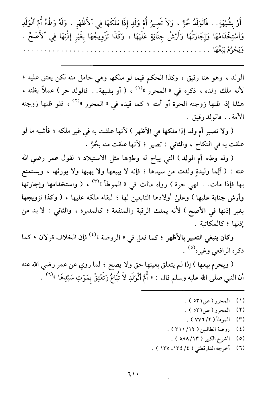 (ويحرم بيعها) إذا لم يتعلق بعينها حق ولا يصح؛ لما روي عن عمر رضي الله عنه أن النبي صلى الله عليه وسلم قال: "أُمُّ الْوَلَدِ لَا تُبَاعُ وَتَعْتِقُ بِمَوْتِ سَيِّدِهَا" (٦).