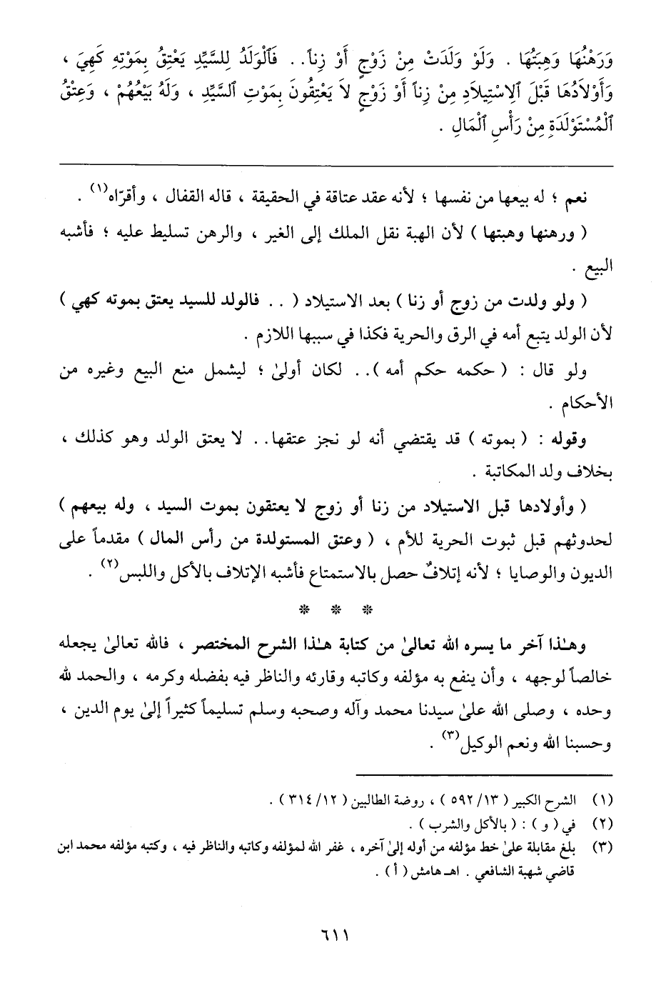 (وأولادها قبل الاستيلاد من زنا أو زوج لا يعتقون بموت السيد، وله بيعهم) لحدوثهم قبل ثبوت الحرية للأم، (وعتق المستولدة من رأس المال) مقدمًا على الديون والوصايا؛ لأنه إتلافٌ حصل بالاستمتاع فأشبه الإتلاف بالأكل واللبس (٢).