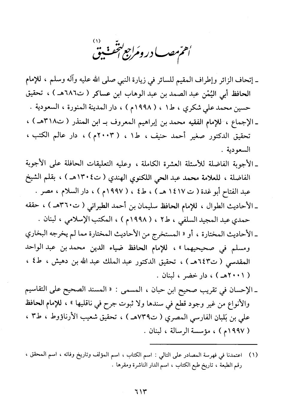 - إتحاف الزائر وإطراف المقيم للسائر في زيارة النبي صلى الله عليه وآله وسلم، للإمام الحافظ أبي اليُمْن عبد الصمد بن عبد الوهاب ابن عساكر (ت ٦٨٦ هـ)، تحقيق حسين محمد علي شكري، ط ١، (١٩٩٨ م)، دار المدينة المنورة، السعودية.
