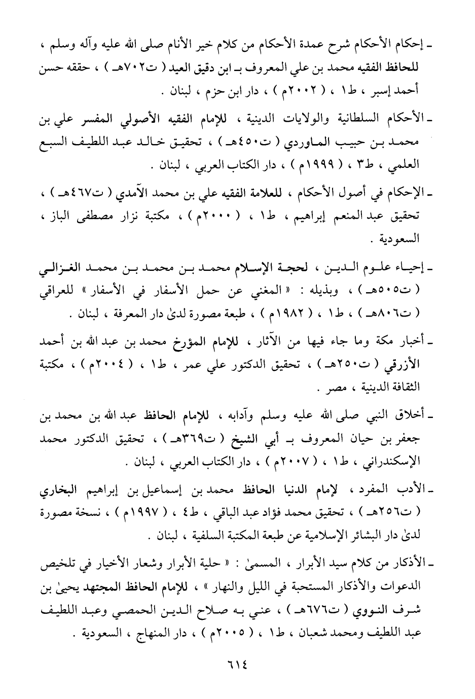- إحكام الأحكام شرح عمدة الأحكام من كلام خير الأنام صلى الله عليه وآله وسلم، للحافظ الفقيه محمد بن علي المعروف بـ ابن دقيق العيد (ت ٧٠٢ هـ)، حققه حسن أحمد إسبر، ط ١، (٢٠٠٢ م)، دار ابن حزم، لبنان.