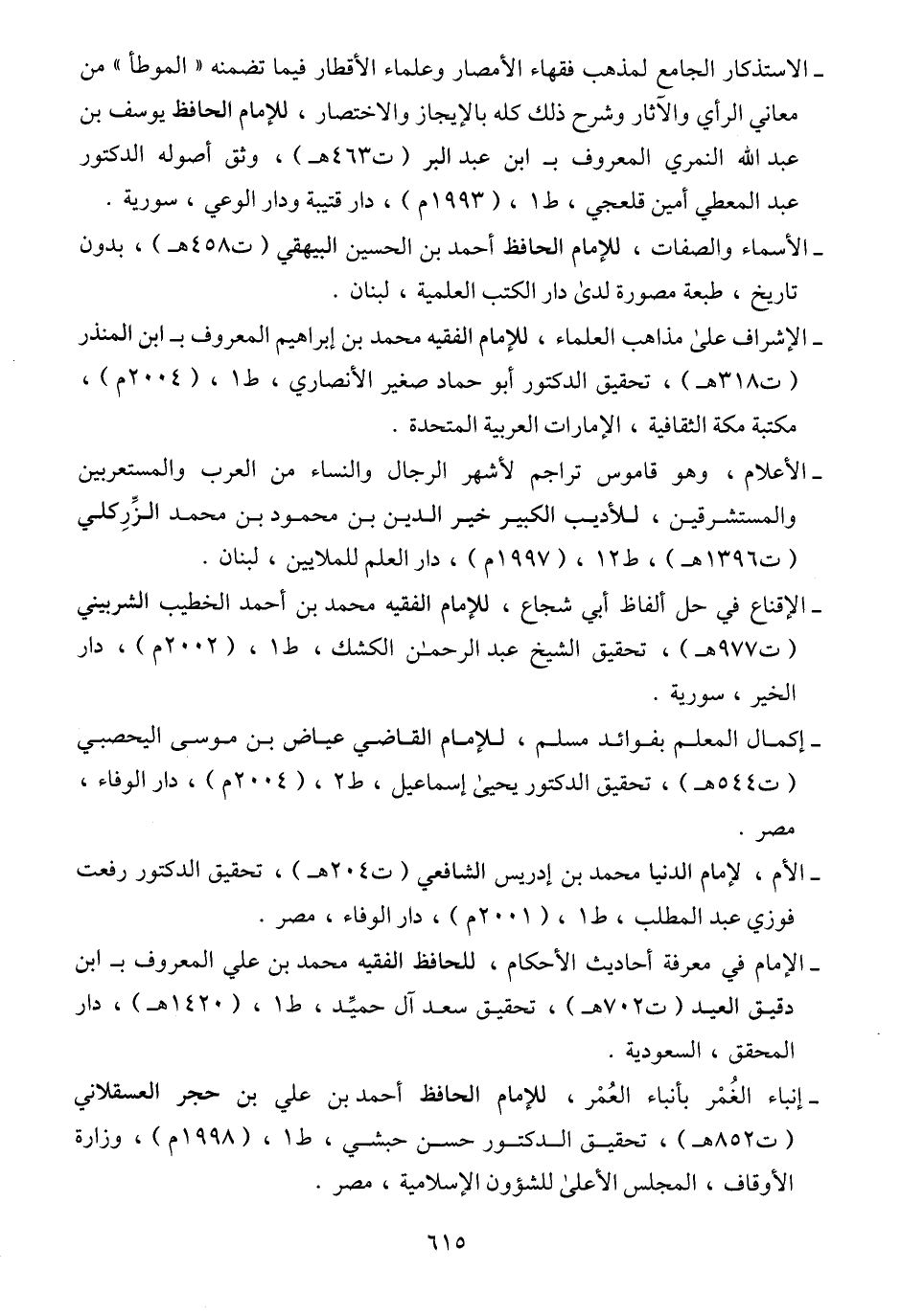 - الاستذكار الجامع لمذهب فقهاء الأمصار وعلماء الأقطار فيما تضمنه "الموطأ" من معاني الرأي والآثار وشرح ذلك كله بالإيجاز والاختصار، للإمام الحافظ يوسف بن عبد الله النمري المعروف بـ ابن عبد البر (ت ٤٦٣ هـ)، وثق أصوله الدكتور عبد المعطي أمين قلعجي، ط ١، (١٩٩٣ م)، دار قتيبة ودار الوعي، سورية.