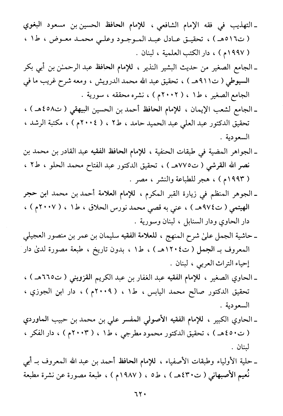 - الحاوي الصغير، للإمام الفقيه عبد الغفار بن عبد الكريم القزويني (ت ٦٦٥ هـ)، تحقيق الدكتور صالح محمد اليابس، ط ١، (٢٠٠٩ م)، دار ابن الجوزي، السعودية.