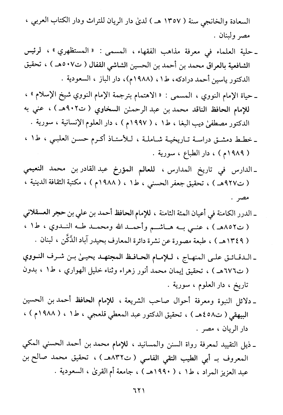 - حياة الإمام النووي، المسمى: "الاهتمام بترجمة الإمام النووي شيخ الإسلام"، للإمام الحافظ الناقد محمد بن عبد الرحمن السخاوي (ت ٩٥٢ هـ)، عني به الدكتور مصطفى ديب البغا، ط ١، (١٩٩٧ م)، دار العلوم الإنسانية، سورية.