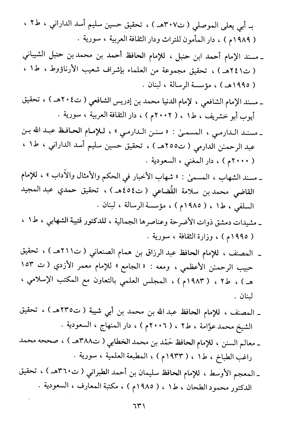 - مسند الإمام الشافعي، لإمام الدنيا محمد بن إدريس الشافعي (ت ٢٠٤ هـ)، تحقيق أيوب أبو خشريف، ط ١، (٢٠٠٢ م)، دار الثقافة العربية، سورية.