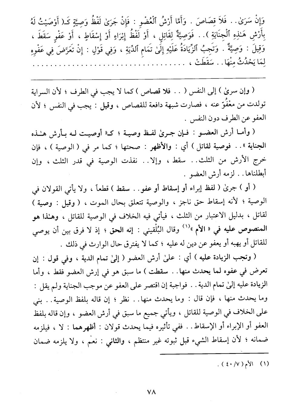 (أو) جرى (لفظ إبراء أو إسقاط أو عفو .. سقط) قطعًا، ولا يأتي القولان في الوصية؛ لأنه إسقاط حق ناجز، والوصية تتعلق بحال الموت، (وقيل: وصية) لقاتل، بدليل الاعتبار من الثلث، فيأتي فيه الخلاف في الوصية للقاتل، وهذا هو المنصوص عليه في "الأم" (١) (وقال البُلْقيني: إنه الحق؛ إذ لا فرق بين أن يوصي للقاتل أو يهبه أو يعفو عن دين له عليه؛ كما لا يفترق حال الوارث في ذلك.