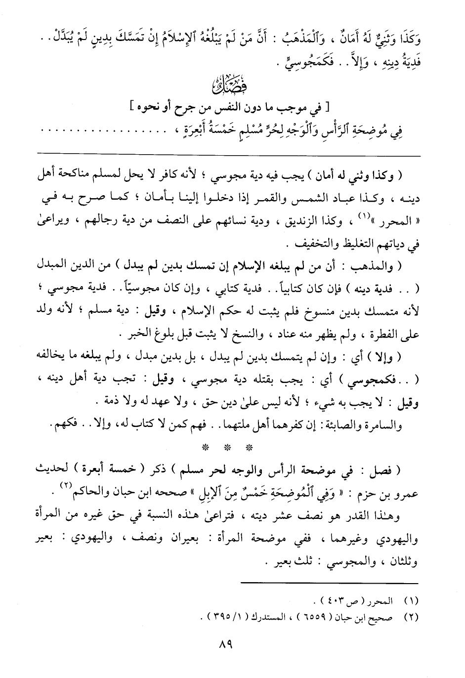 (وإلا) أي: وإن لم يتمسك بدين لم يبدل، بل بدين مبدل، ولم يبلغه ما يخالفه ( .. فكمجوسي) أي: يجب بقتله دية مجوسي، وقيل: تجب دية أهل دينه، وقيل: لا يجب به شيء؛ لأنه ليس على دين حق، ولا عهد له ولا ذمة.