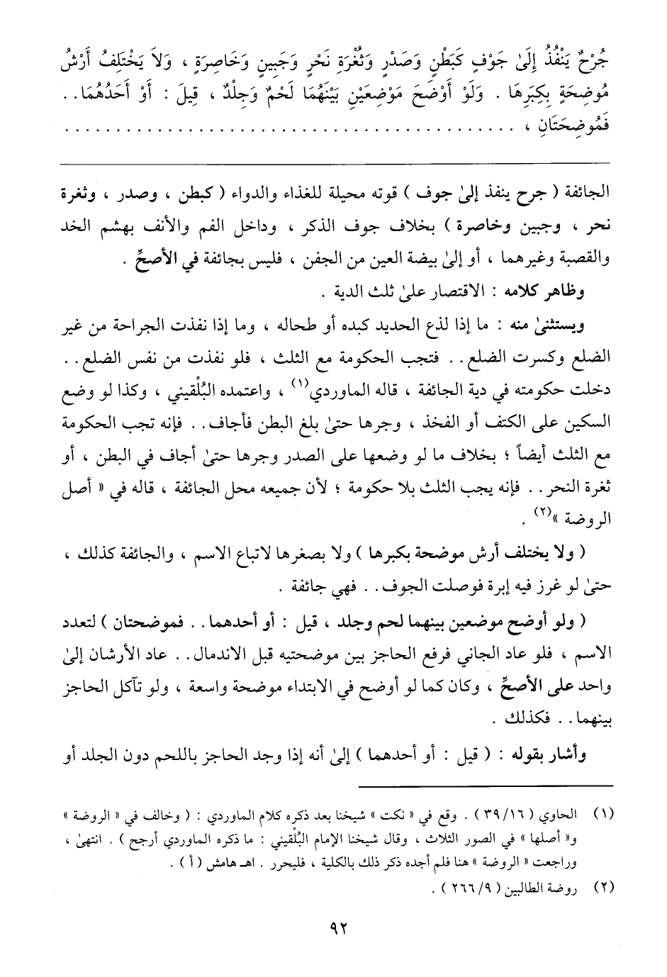 الجائفة (جرح ينفذ إلى جوف) قوته محيلة للغذاء والدواء (كبطن، وصدر، وثغرة نحر، وجبين وخاصرة) بخلاف جوف الذكر، وداخل الفم والأنف بهشم الخد والقصبة وغيرهما، أو إلى بيضة العين من الجفن، فليس بجائفة في الأصحِّ.
