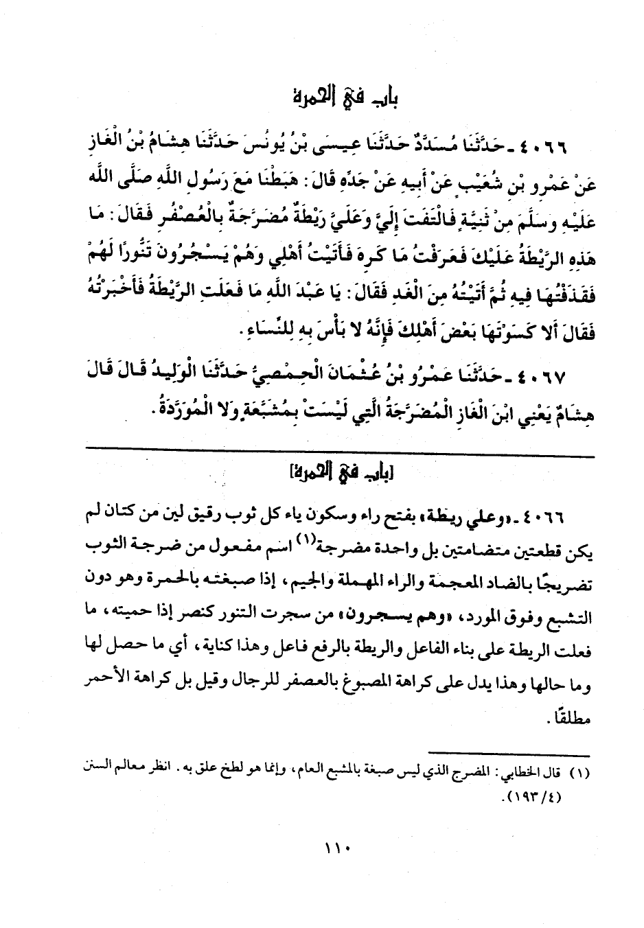 4066 - "وعلي ريطة" بفتح راء وسكون ياء كل ثوب رقيق لين من كتان لم يكن قطعتين متضامتين بل واحدة مضرجة (¬1) اسم مفعول من ضرجة الثوب تضريجًا بالضاد المعجمة والراء المهملة والجيم، إذا صبغته بالحمرة وهو دون التشبع وفوق المورد، "وهم يسجرون" فمن سجرت التنور كنصر إذا حميته، ما فعلت الريطة على بناء الفاعل والريطة بالرفع فاعل وهذا كناية، أي ما حصل لها وما حالها وهذا يدل على كراهة المصبوغ بالعصفر للرجال وقيل بل كراهة الأحمر مطلقًا.