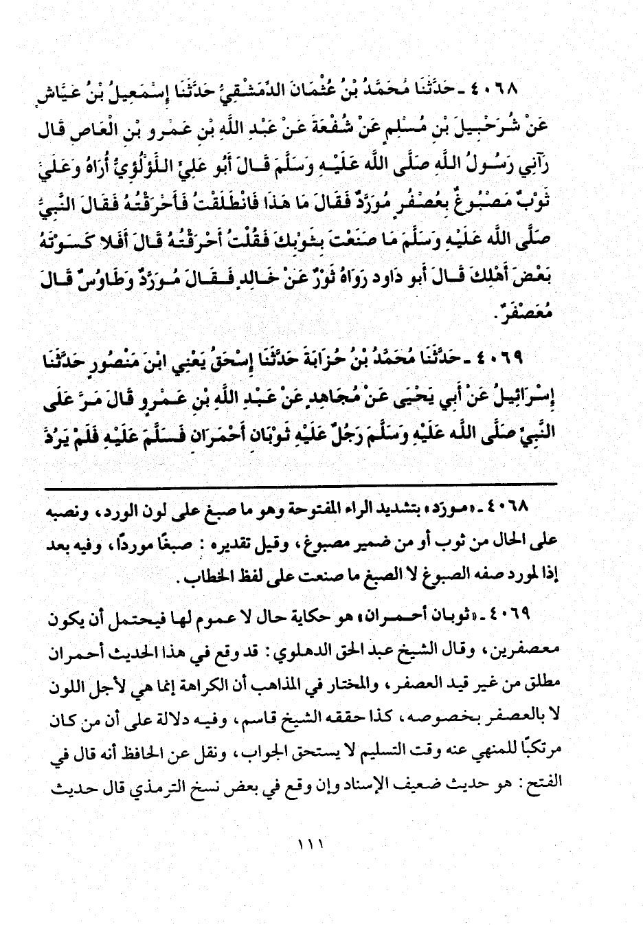 4069 - حَدَّثَنَا مُحَمَّدُ بْنُ حُزَابَةَ، حَدَّثَنَا إِسْحَاقُ يَعْنِي ابْنَ مَنْصُورٍ، حَدَّثَنَا إِسْرَائِيلُ، عَنْ أَبِي يَحْيَى، عَنْ مُجَاهِدٍ، عَنْ عَبْدِ اللَّهِ بْنِ عَمْرٍو، قَالَ: «مَرَّ عَلَى النَّبِيِّ صَلَّى اللهُ عَلَيْهِ وَسَلَّمَ رَجُلٌ عَلَيْهِ ثَوْبَانِ أَحْمَرَانِ، فَسَلَّمَ عَلَيْهِ، فَلَمْ يَرُدَّ