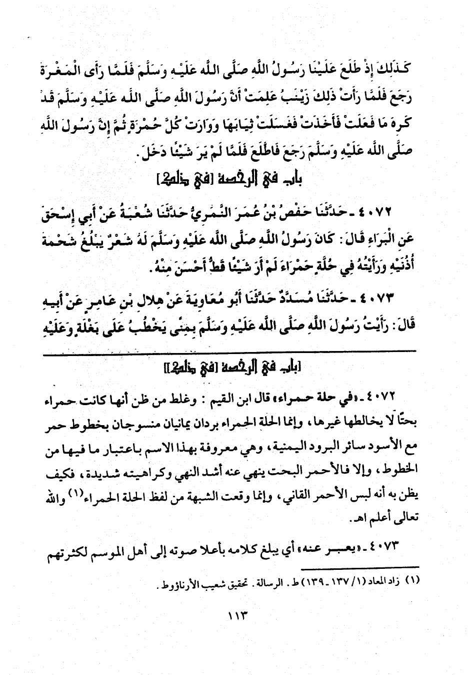4072 - "في حلة حمراء" قال ابن القيم: وغلط من ظن أنها كانت حمراء بحتًا لا يخالطها غيرها، وإنما الصفة الحمراء بردان يمانيان منسوجان بخطوط حمر مع الأسود سائر البرود اليمنية، وهي معروفة بهذا الاسم باعتبار ما فيها من المخطوط، وإلا فالأحمر البحت ينهي عنه أشد النهي وكراهيته شديدة، فكيف يظن به أنه لبس الأحمر القاني، وإنما وقعت الشبهة من لفظ الحلة الحمراء (¬1) والله تعالى أعلم اهـ.