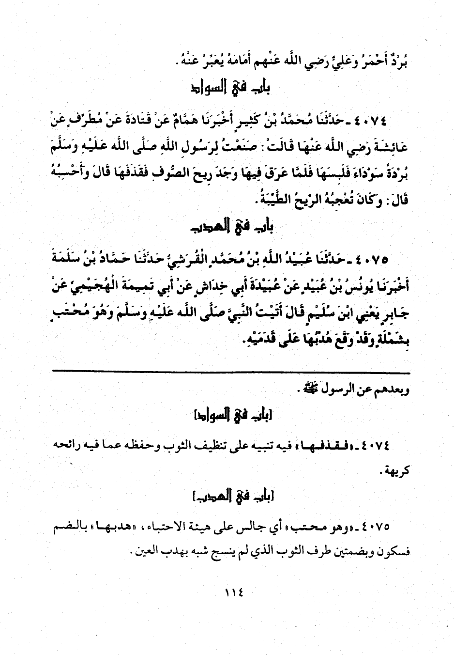 4075 - "وهو محتب" أي جالس على هيئة الاحتباء، "هدبها" بالضم فسكون وبضمتين طرف الثوب الذي لم ينسج شبه بهدب العين.