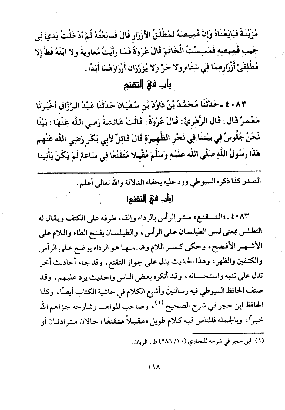 4083 - "التقنع" ستر الرأس بالرداء وإلقاء طرفه على الكتف ويقال له التطلس بمعنى لبس الطيلسان على الرأس، والطيلسان بفتح الطاء واللام على الأشهر الأفصح، وحكى كسر اللام وضمها هو الرداء يوضع على الرأس والكتافين والظهر، وهذا الحديث يدل على جواز التقنع، وقد جاء أحاديث أخر تدل على ندبه واستحسانه، وقد أنكره بعض الناس والحديث يرد عليهم، وقد صنف الحافظ السيوطي فيه رسالتين وأشبع الكلام في حاشية الكتاب أيضًا، وكذا الحافظ ابن حجر في شرح الصحيح (¬1)، وصاحب المواهب وشارحه جزاهم الله خيرًا، وبالجملة فللناس فيه كلام طويل "مقبلًا متقنعًا" حالان مترادفان أو