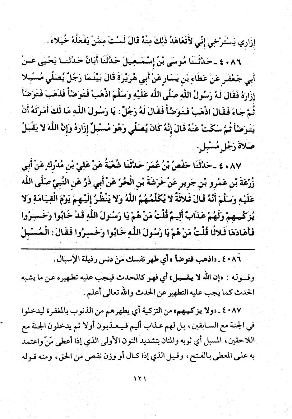 4086 - "اذهب فتوضأ"، أي طهر نفسك من دنس رذيلة الإسبال.