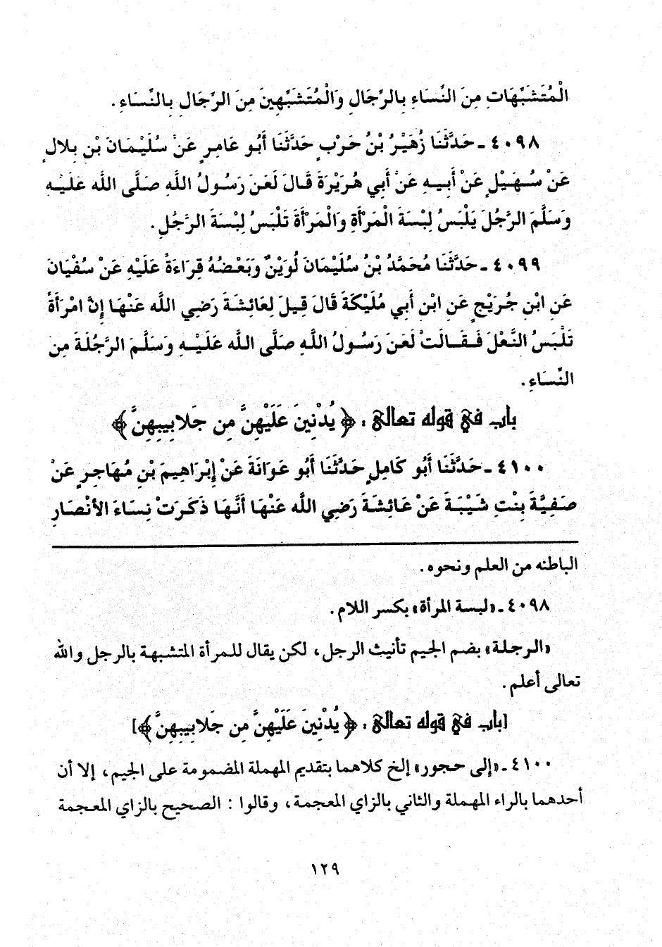 بَابٌ فِي قَوْلِهِ تَعَالَى: {يُدْنِينَ عَلَيْهِنَّ مِنْ جَلَابِيبِهِنَّ}