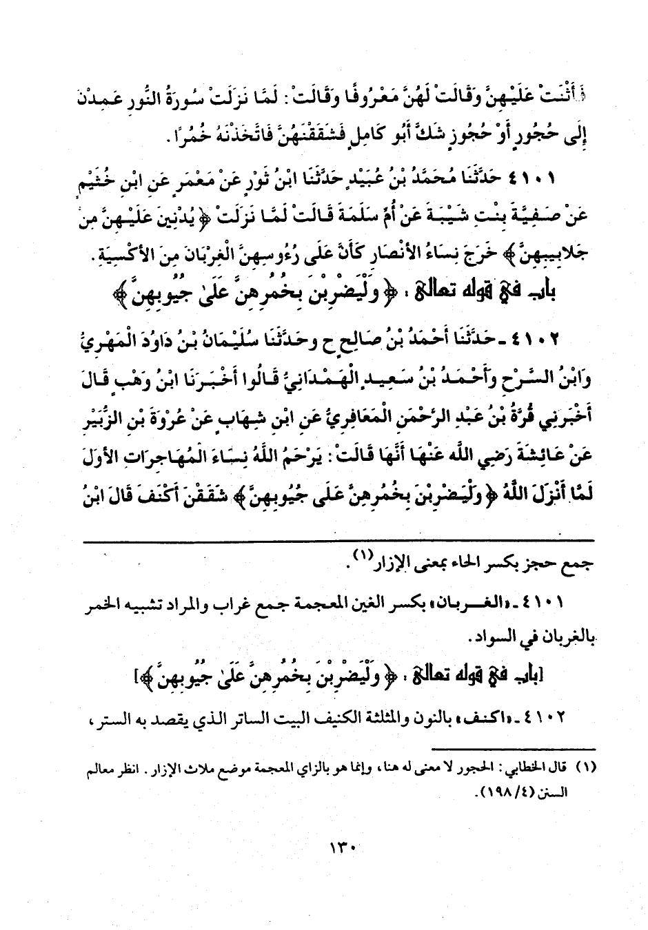 4101 - حَدَّثَنَا مُحَمَّدُ بْنُ عُبَيْدٍ، حَدَّثَنَا ابْنُ ثَوْرٍ، عَنْ مَعْمَرٍ، عَنِ ابْنِ خُثَيْمٍ، عَنْ صَفِيَّةَ بِنْتِ شَيْبَةَ، عَنْ أُمِّ سَلَمَةَ، قَالَتْ: لَمَّا نَزَلَتْ: {يُدْنِينَ عَلَيْهِنَّ مِنْ جَلَابِيبِهِنَّ} [الأحزاب: 59]، خَرَجَ نِسَاءُ الْأَنْصَارِ كَأَنَّ عَلَى رُءُوسِهِنَّ الْغِرْبَانَ مِنَ الأَكْسِيَةِ.