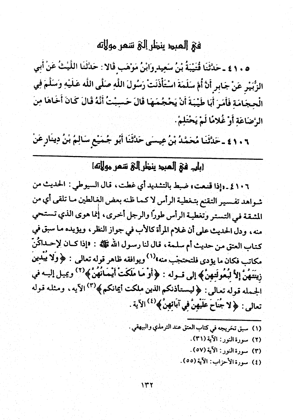 4106 - "إذا قنعت" ضبط بالتشديد أي غطت، قال السيوطي: الحديث من شواهد تفسير التقنع بتغطية الرأس لا كما ظنه بعض الغالطين ما تلقى أي من المشقة في التستر وتغطية الرأس طورًا والرجل أخرى، إنما هوى الذي تستحي منه، ودل الحديث على أن غلام المرأة كالأب في جواز النظر، ويؤيده ما سبق في كتاب العتق من حديث أم سلمة، قال لنا رسول الله - صلى الله عليه وسلم -: "إذا كان لإحداكُنّ مكاتب فكان ما يؤدى فلتحتحب منه" (¬1) ويوافقه ظاهر قوله تعالى: {وَلَا يُبْدِينَ زِينَتَهُنَّ إلا لِبُعُولَتِهِنَّ} إلى قوله: {أَوْ مَا مَلَكَتْ أَيمَانُهُنَّ} (¬2) ويميل إليه في الجمله قوله تعالى: {لِيَسْتَأْذِنْكُمُ الَّذِينَ مَلَكَتْ أَيمَانُكُمْ} (¬3) الآية، ومثله قوله تعالى: {لَا جُنَاحَ عَلَيهِنَّ فِي آبَائِهِنَّ} (¬4) الآية.