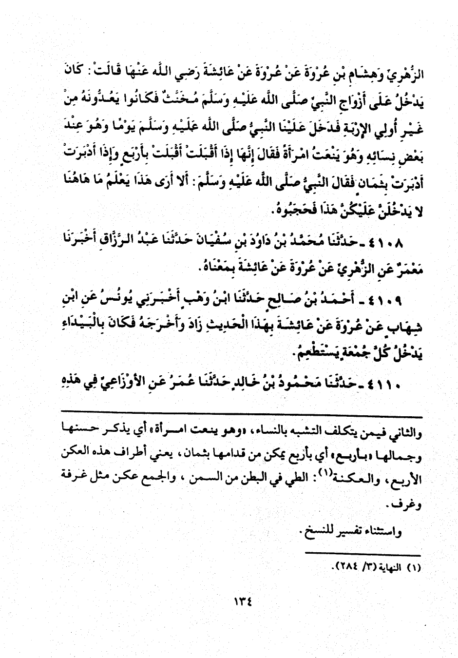 الزُّهْرِيِّ، وَهِشَامِ بْنِ عُرْوَةَ، عَنْ عُرْوَةَ، عَنْ عَائِشَةَ رَضِيَ اللَّهُ عَنْهَا، قَالَتْ: كَانَ يَدْخُلُ عَلَى أَزْوَاجِ النَّبِيِّ صَلَّى اللهُ عَلَيْهِ وَسَلَّمَ مُخَنَّثٌ، فَكَانُوا يَعُدُّونَهُ مِنْ غَيْرِ أُولِي الْإِرْبَةِ، فَدَخَلَ عَلَيْنَا النَّبِيُّ صَلَّى اللهُ عَلَيْهِ وَسَلَّمَ يَوْمًا وَهُوَ عِنْدَ بَعْضِ نِسَائِهِ، وَهُوَ يَنْعَتُ امْرَأَةً، فَقَالَ: إِنَّهَا إِذَا أَقْبَلَتْ أَقْبَلَتْ بِأَرْبَعٍ، وَإِذَا أَدْبَرَتْ أَدْبَرَتْ بِثَمَانٍ، فَقَالَ النَّبِيُّ صَلَّى اللهُ عَلَيْهِ وَسَلَّمَ: «أَلَا أَرَى هَذَا يَعْلَمُ مَا هَاهُنَا، لَا يَدْخُلَنَّ عَلَيْكُنَّ هَذَا» فَحَجَبُوهُ.
