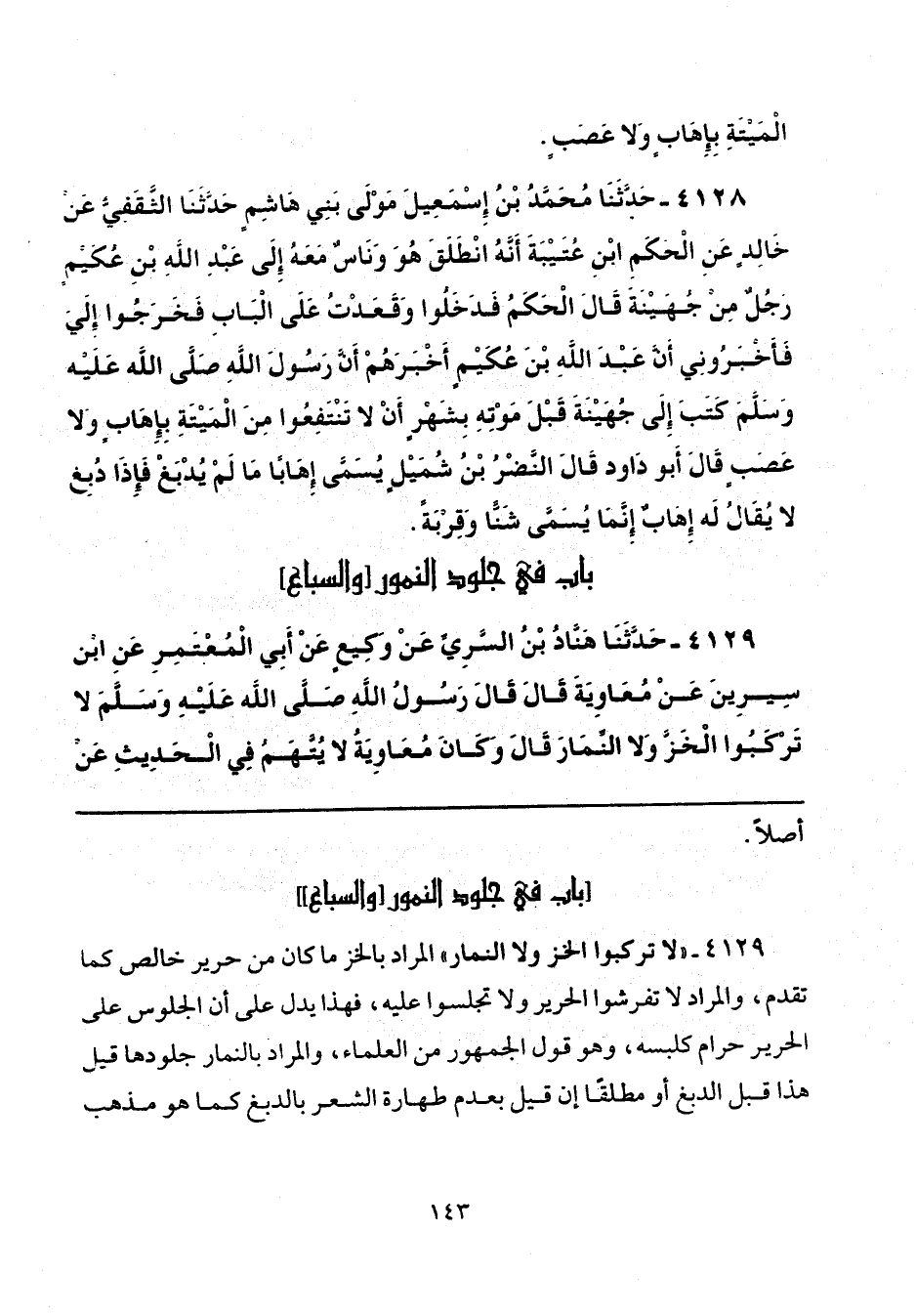 4128 - حَدَّثَنَا مُحَمَّدُ بْنُ إِسْمَاعِيلَ، مَوْلَى بَنِي هَاشِمٍ، حَدَّثَنَا الثَّقَفِيُّ، عَنْ خَالِدٍ، عَنِ الْحَكَمِ بْنِ عُتَيْبَةَ، أَنَّهُ انْطَلَقَ هُوَ وَنَاسٌ مَعَهُ إِلَى عَبْدِ اللَّهِ بْنِ عُكَيْمٍ، - رَجُلٌ مِنْ جُهَيْنَةَ -، قَالَ الْحَكَمُ: فَدَخَلُوا وَقَعَدْتُ عَلَى الْبَابِ، فَخَرَجُوا إِلَيَّ فَأَخْبَرُونِي، أَنَّ عَبْدَ اللَّهِ بْنَ عُكَيْمٍ، أَخْبَرَهُمْ، أَنَّ رَسُولَ اللَّهِ صَلَّى اللهُ عَلَيْهِ وَسَلَّمَ كَتَبَ إِلَى جُهَيْنَةَ قَبْلَ مَوْتِهِ بِشَهْرٍ: «أَنْ لَا تَنْتَفِعُوا مِنَ الْمَيْتَةِ بِإِهَابٍ، وَلَا عَصَبٍ» قَالَ أَبُو دَاوُدَ: قَالَ النَّضْرُ بْنُ شُمَيْلٍ: يُسَمَّى إِهَابًا مَا لَمْ يُدْبَغْ، فَإِذَا دُبِغَ لَا يُقَالُ لَه: إِهَابٌ، إِنَّمَا يُسَمَّى شَنًّا وَقِرْبَةً.