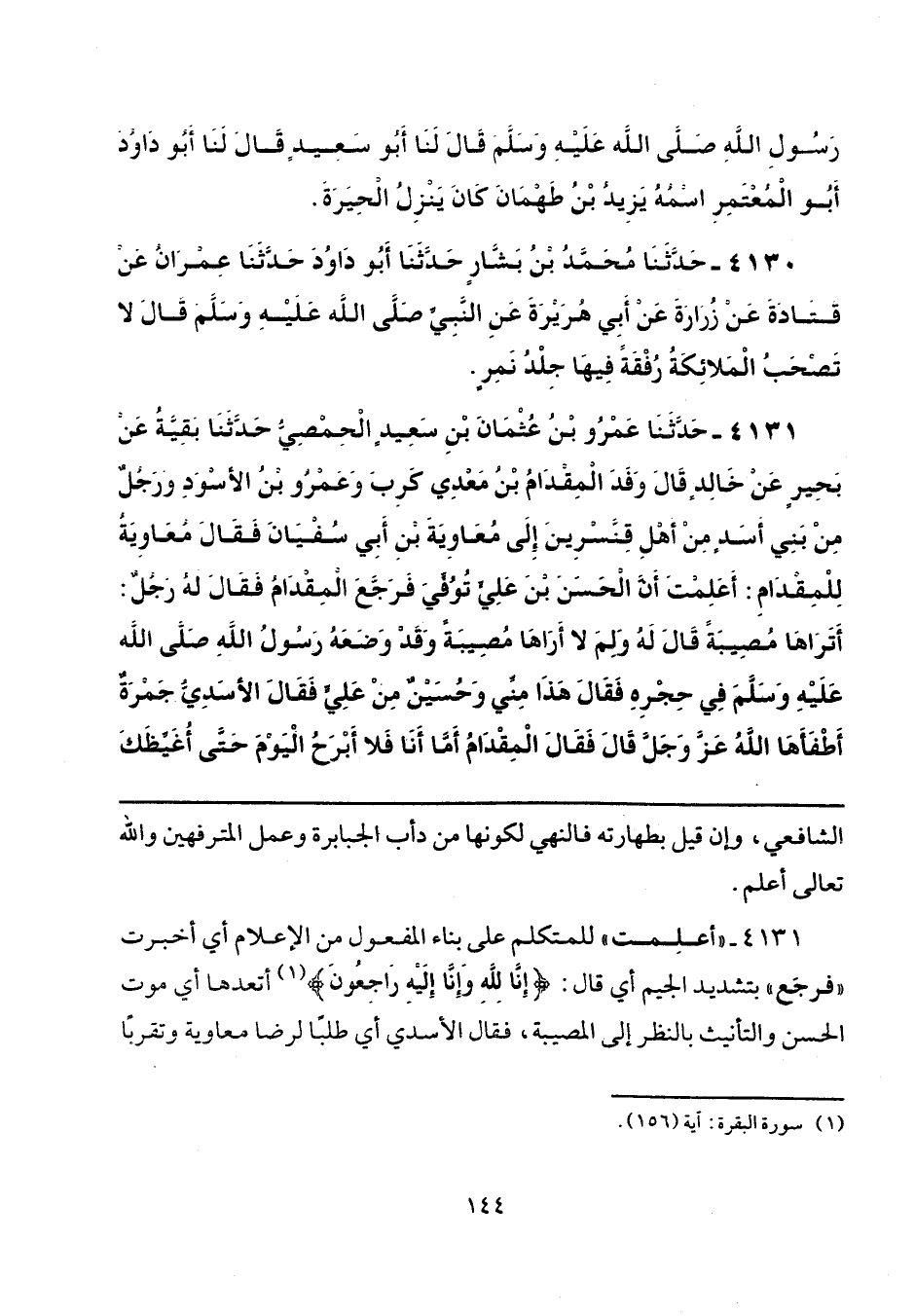 4131 - حَدَّثَنَا عَمْرُو بْنُ عُثْمَانَ بْنِ سَعِيدٍ الْحِمْصِيُّ، حَدَّثَنَا بَقِيَّةُ، عَنْ بَحِيرٍ، عَنْ خَالِدٍ، قَالَ: وَفَدَ الْمِقْدَامُ بْنُ مَعْدِي كَرِبَ، وَعَمْرُو بْنُ الْأَسْوَدِ، وَرَجُلٌ مِنْ بَنِي أَسَدٍ مِنْ أَهْلِ قِنَّسْرِينَ إِلَى مُعَاوِيَةَ بْنِ أَبِي سُفْيَانَ، فَقَالَ مُعَاوِيَةُ لِلْمِقْدَامِ: أَعَلِمْتَ أَنَّ الْحَسَنَ بْنَ عَلِيٍّ تُوُفِّيَ؟ فَرَجَّعَ الْمِقْدَامُ، فَقَالَ لَهُ رَجُلٌ: أَتَرَاهَا مُصِيبَةً؟ قَالَ لَهُ: وَلِمَ لَا أَرَاهَا مُصِيبَةً، وَقَدْ وَضَعَهُ رَسُولُ اللَّهِ صَلَّى اللهُ عَلَيْهِ وَسَلَّمَ فِي حِجْرِهِ فَقَالَ: «هَذَا مِنِّي» وَحُسَيْنٌ مِنْ عَلِيٍّ؟ ، فَقَالَ الْأَسَدِيُّ: جَمْرَةٌ أَطْفَأَهَا اللَّهُ عَزَّ وَجَلَّ. قَالَ: فَقَالَ الْمِقْدَامُ: أَمَّا أَنَا فَلَا أَبْرَحُ الْيَوْمَ حَتَّى أُغَيِّظَكَ،