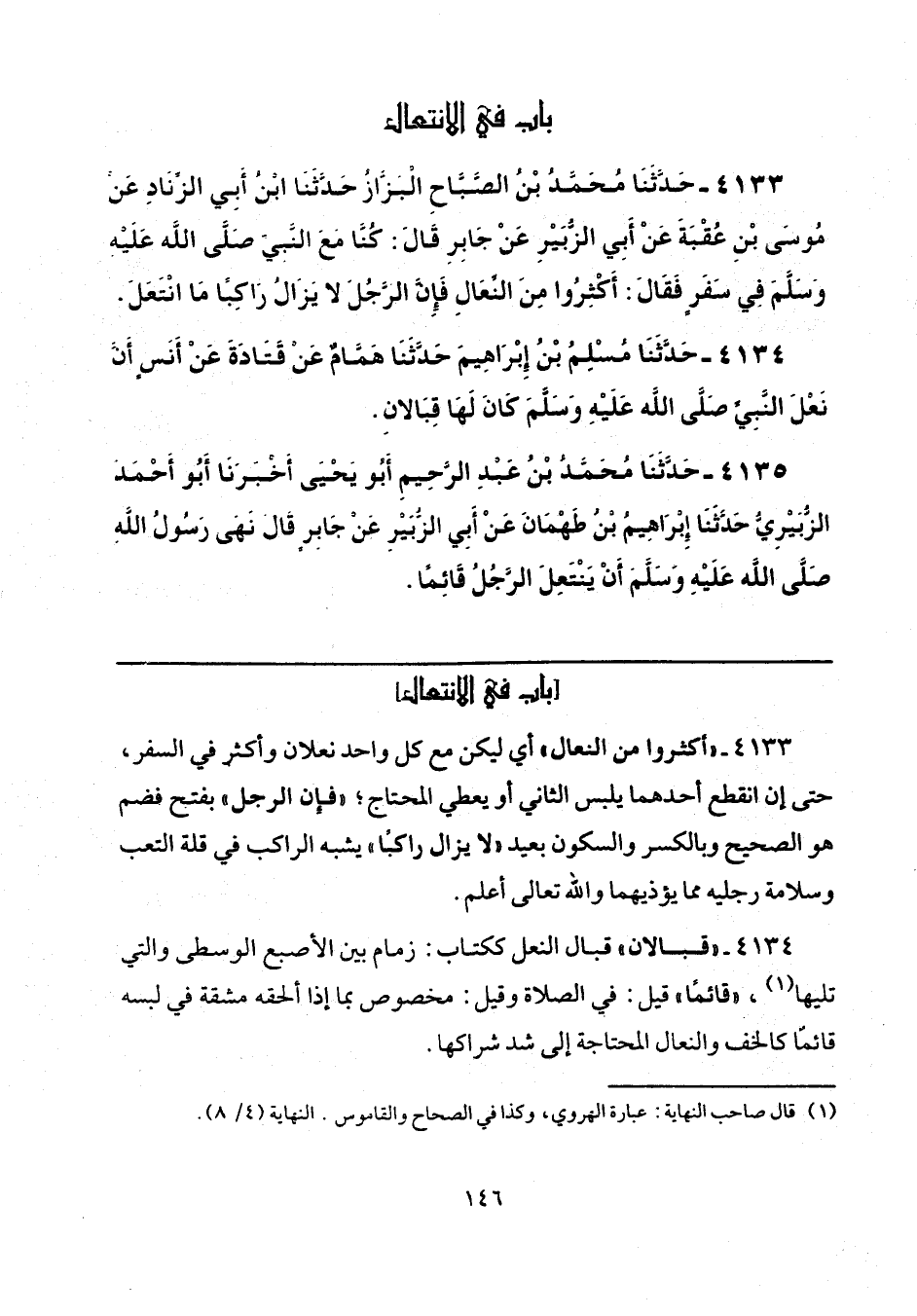 4133 - "أكثروا من النعال" أي ليكن مع كل واحد نعلان وأكثر في السفر، حتى إن انقطع أحدهما يلبس الثاني أو يعطي المحتاج؛ "فإن الرجل" بفتح فضم هو الصحيح وبالكسر والسكون بعيد "لا يزال راكبًا" يشبه الراكب في قلة التعب وسلامة رجليه مما يؤذيهما والله تعالى أعلم.