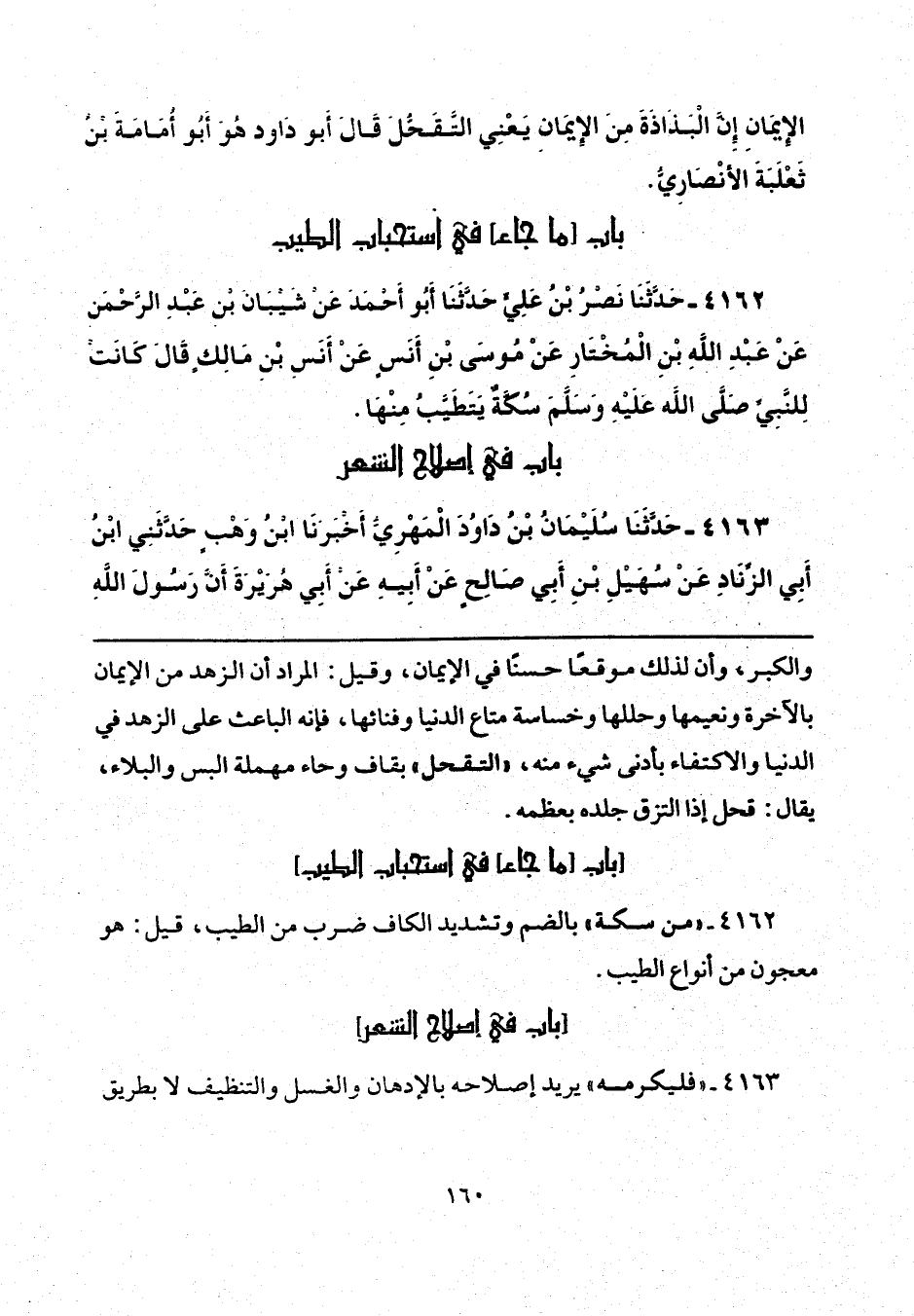 4162 - حَدَّثَنَا نَصْرُ بْنُ عَلِيٍّ، حَدَّثَنَا أَبُو أَحْمَدَ، عَنْ شَيْبَانَ بْنِ عَبْدِ الرَّحْمَنِ، عَنْ عَبْدِ اللَّهِ بْنِ الْمُخْتَارِ، عَنْ مُوسَى بْنِ أَنَسٍ، عَنْ أَنَسِ بْنِ مَالِكٍ، قَالَ: «كَانَتْ لِلنَّبِيِّ صَلَّى اللهُ عَلَيْهِ وَسَلَّمَ سُكَّةٌ يَتَطَيَّبُ مِنْهَا».