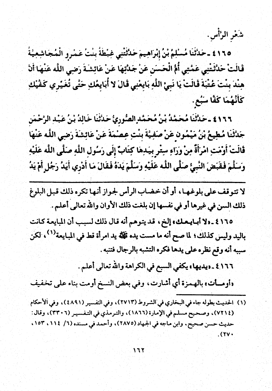 4165 - "لا أبايعك" إلخ، قد يتوهم أنه قال ذلك لسبب أن المبايعة كانت باليد وليس كذلك؛ لما صح أنه ما مست يده - صلى الله عليه وسلم - يد امرأة قط في المبايعة (¬1)، لكن سببه أنه وقع نظره على يدها فكره التشبه بالرجال فتنبه.
