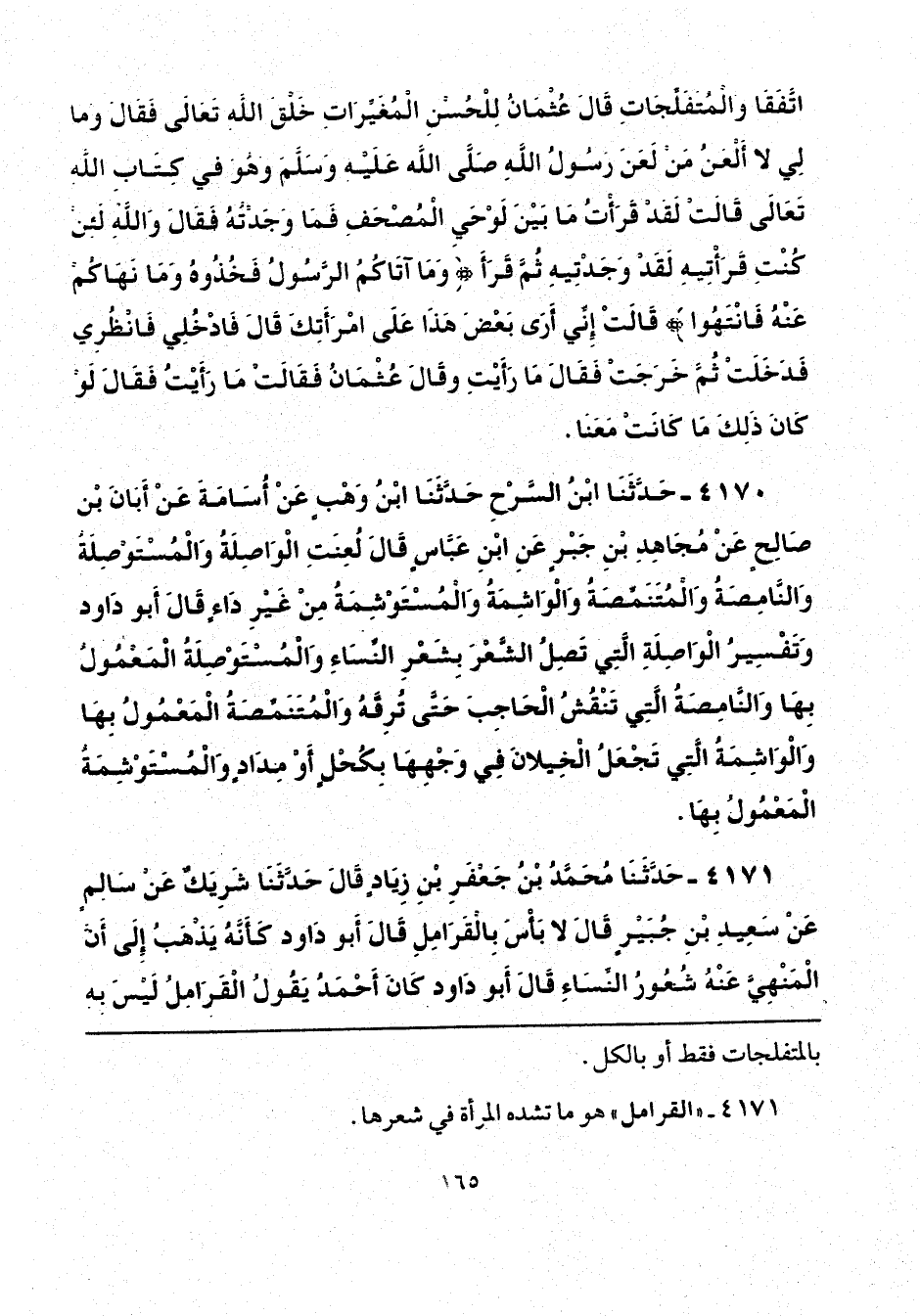 4171 - حَدَّثَنَا مُحَمَّدُ بْنُ جَعْفَرِ بْنِ زِيَادٍ، قَالَ: حَدَّثَنَا شَرِيَكٌ، عَنْ سَالِمٍ، عَنْ سَعِيدِ بْنِ جُبَيْرٍ، قَالَ: «لَا بَأْسَ بِالْقَرَامِلِ»، قَالَ أَبُو دَاوُدَ: «كَأَنَّهُ يَذْهَبُ إِلَى أَنَّ الْمَنْهِيَّ عَنْهُ شُعُورُ النِّسَاءِ»، قَالَ أَبُو دَاوُدَ: كَانَ أَحْمَدُ يَقُولُ: الْقَرَامِلُ لَيْسَ بِهِ