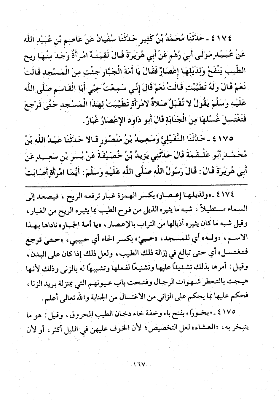 4175 - حَدَّثَنَا النُّفَيْلِيُّ، وَسَعِيدُ بْنُ مَنْصُورٍ، قَالَا: حَدَّثَنَا عَبْدُ اللَّهِ بْنُ مُحَمَّدٍ أَبُو عَلْقَمَةَ، قَالَ: حَدَّثَنِي يَزِيدُ بْنُ خُصَيْفَةَ، عَنْ بُسْرِ بْنِ سَعِيدٍ، عَنْ أَبِي هُرَيْرَةَ، قَالَ: قَالَ رَسُولُ اللَّهِ صَلَّى اللهُ عَلَيْهِ وَسَلَّمَ: «أَيُّمَا امْرَأَةٍ أَصَابَتْ