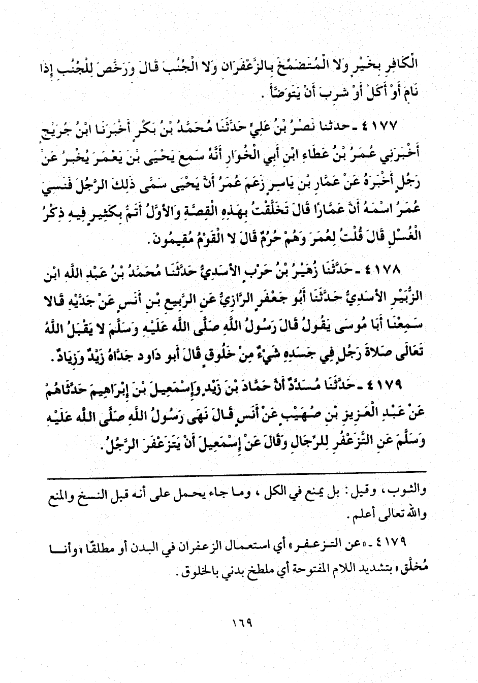 4179 - حَدَّثَنَا مُسَدَّدٌ، أَنَّ حَمَّادَ بْنَ زَيْدٍ، وَإِسْمَاعِيلَ بْنَ إِبْرَاهِيمَ، حَدَّثَاهُمْ، عَنْ عَبْدِ الْعَزِيزِ بْنِ صُهَيْبٍ، عَنْ أَنَسٍ، قَالَ: «نَهَى رَسُولُ اللَّهِ صَلَّى اللهُ عَلَيْهِ وَسَلَّمَ عَنِ التَّزَعْفُرِ لِلرِّجَالِ»، وَقَالَ: عَنْ إِسْمَاعِيلَ: «أَنْ يَتَزَعْفَرَ الرَّجُلُ».