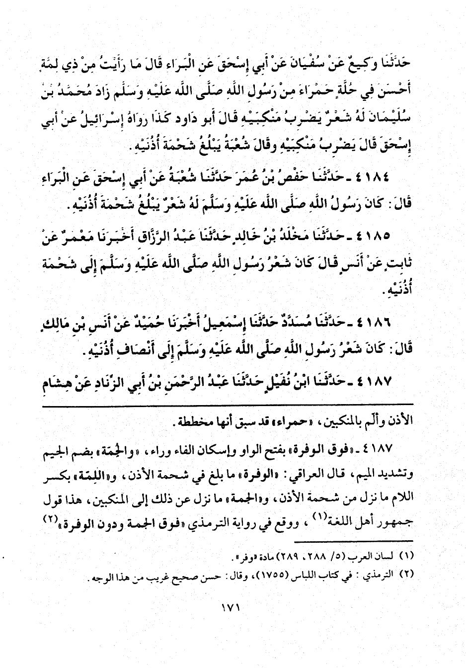4187 - "فوق الوفرة" بفتح الواو وإسكان الفاء وراء، "والجُمَّة" بضم الجيم وتشديد الميم، قال العراقي: "الوفرة" ما بلغ في شحمة الأذن، و "اللِمّة" بكسر اللام ما نزل من شحمة الأذن، و "الجمة" ما نزل عن ذلك إلى المنكبين، هذا قول جمهور أهل اللغة (¬1)، ووقع في رواية الترمذي "فوق الجمة ودون الوفرة" (¬2)