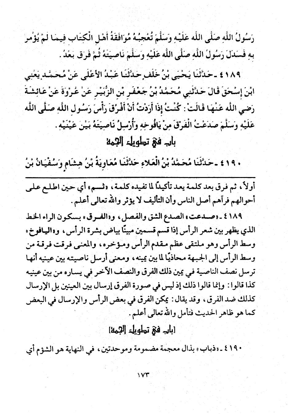 4189 - "صدعت" الصاع الشق والفصل، و"الفرق" بسكون الراء الخط الذي يظهر بين شعر الرأس إذا قسم قسمين مبينًا بياض بشرة الرأس، و"اليافوخ" وسط الرأس وهو ملتقى عظم مقدم الرأس ومؤخره، والمعنى فرقت فرقة من وسط الرأس إلى الجبهة محاذيًا لما بين يمينه؛ ومعنى أرسل ناصيته بين عينيه أنها ترسل نصف الناصية في يمين ذلك الفرق والنصف الآخر في يساره من بين عينيه كذا قالوا: وإنما قالوا ذلك إذ ليس في سورة الفرق إرسال بين العينين بل الإرسال كذلك ضد الفرق، وقد يقال: يمكن الفرق في بعض الرأس والإرسال في البعض كما هو ظاهر الحديث فتأمل والله تعالى أعلم.