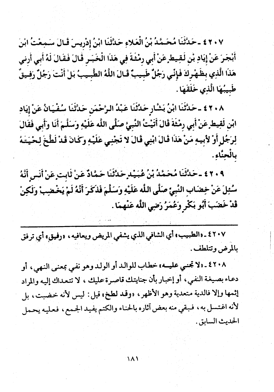 4207 - » حَدَّثَنَا مُحَمَّدُ بْنُ الْعَلَاءِ، حَدَّثَنَا ابْنُ إِدْرِيسَ، قَالَ: سَمِعْتُ ابْنَ أَبْجَرَ، عَنْ إِيَادِ بْنِ لَقِيطٍ، عَنْ أَبِي رِمْثَةَ، فِي هَذَا الْخَبَرِ، قَالَ: فَقَالَ لَهُ أَبِي: أَرِنِي هَذَا الَّذِي بِظَهْرِكَ، فَإِنِّي رَجُلٌ طَبِيبٌ، قَالَ: «اللَّهُ الطَّبِيبُ، بَلْ أَنْتَ رَجُلٌ رَفِيقٌ، طَبِيبُهَا الَّذِي خَلَقَهَا».