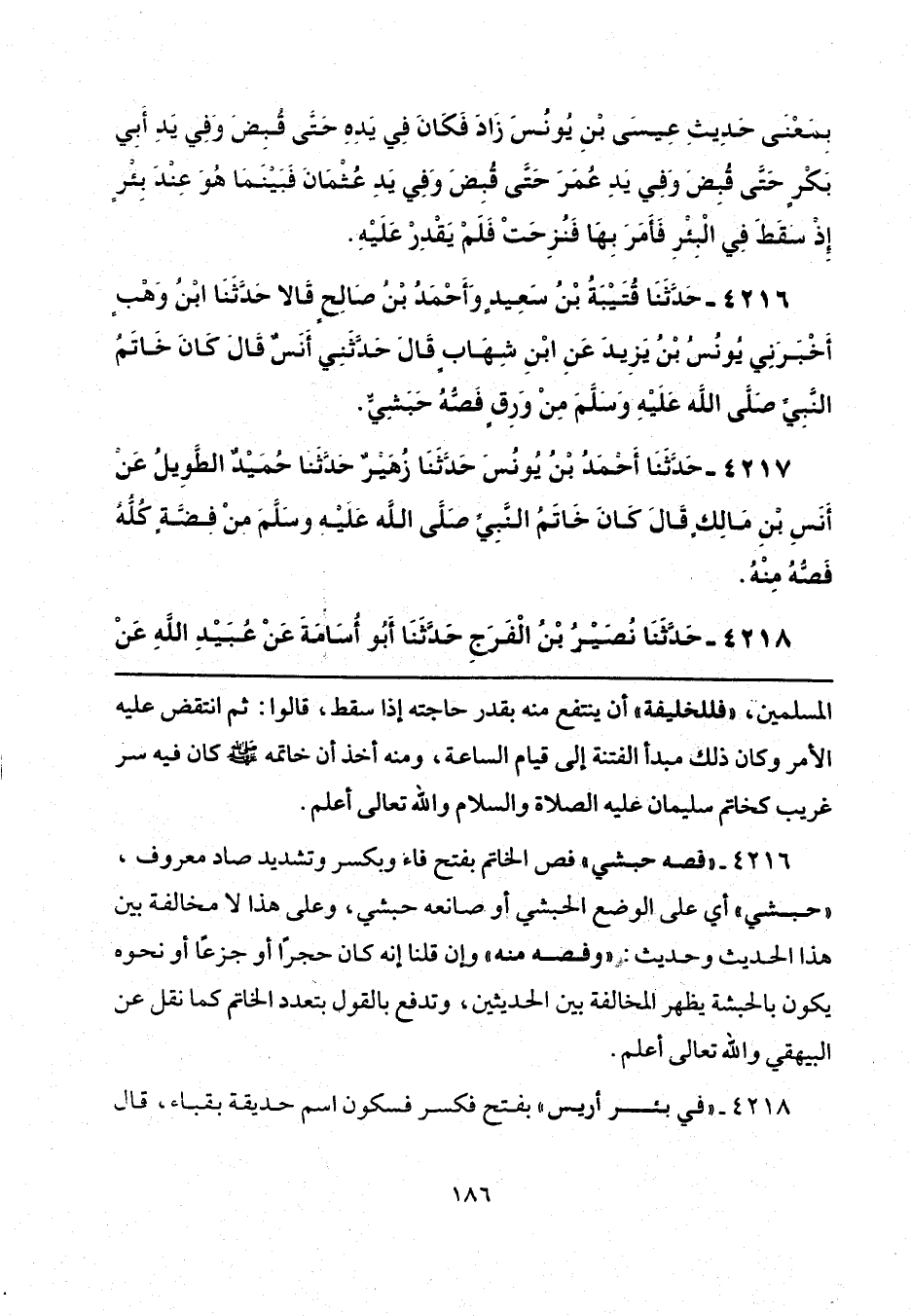 4216 - "قصه حبشي" فص الخاتم بفتح فاء وبكسر وتشديد صاد معروف، "حبشي" أي على الوضع الحبشي أو صانعه حبشي، وعلى هذا لا مخالفة بين هذا الحديث وحديث: "وفصه منه" وإن قلنا إنه كان حجرًا أو جزعًا أو نحوه يكون بالحبشة يظهر المخالفة بين الحديثين، وتدفع بالقول بتعدد الخاتم كما نقل عن البيهقي والله تعالى أعلم.