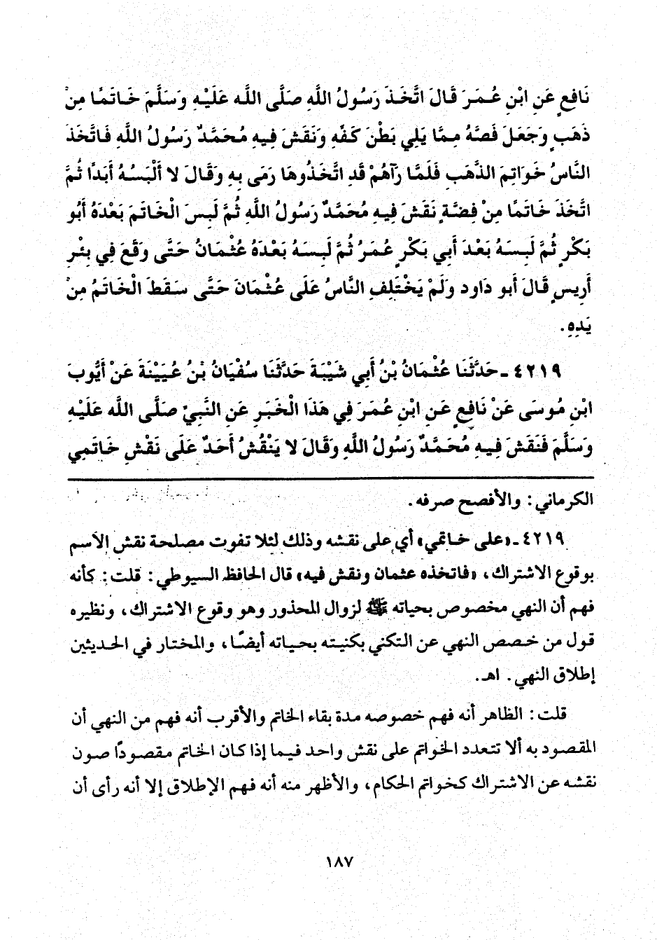 4219 - "على خاتمي" أي على نقشه وذلك لئلا تفوت مصلحة نقش الاسم بوقوع الاشتراك، "فاتخذه عثمان ونقش فيه" قال الحافظ السيوطي: قلت: كأنه فهم أن النهي مخصوص بحياته - صلى الله عليه وسلم - لزوال المحذور وهو وقوع الاشتراك، ونظيره قول من خصص النهي عن التكني بكنيته بحياته أيضًا، والمختار في الحديثين إطلاق النهي. اهـ.