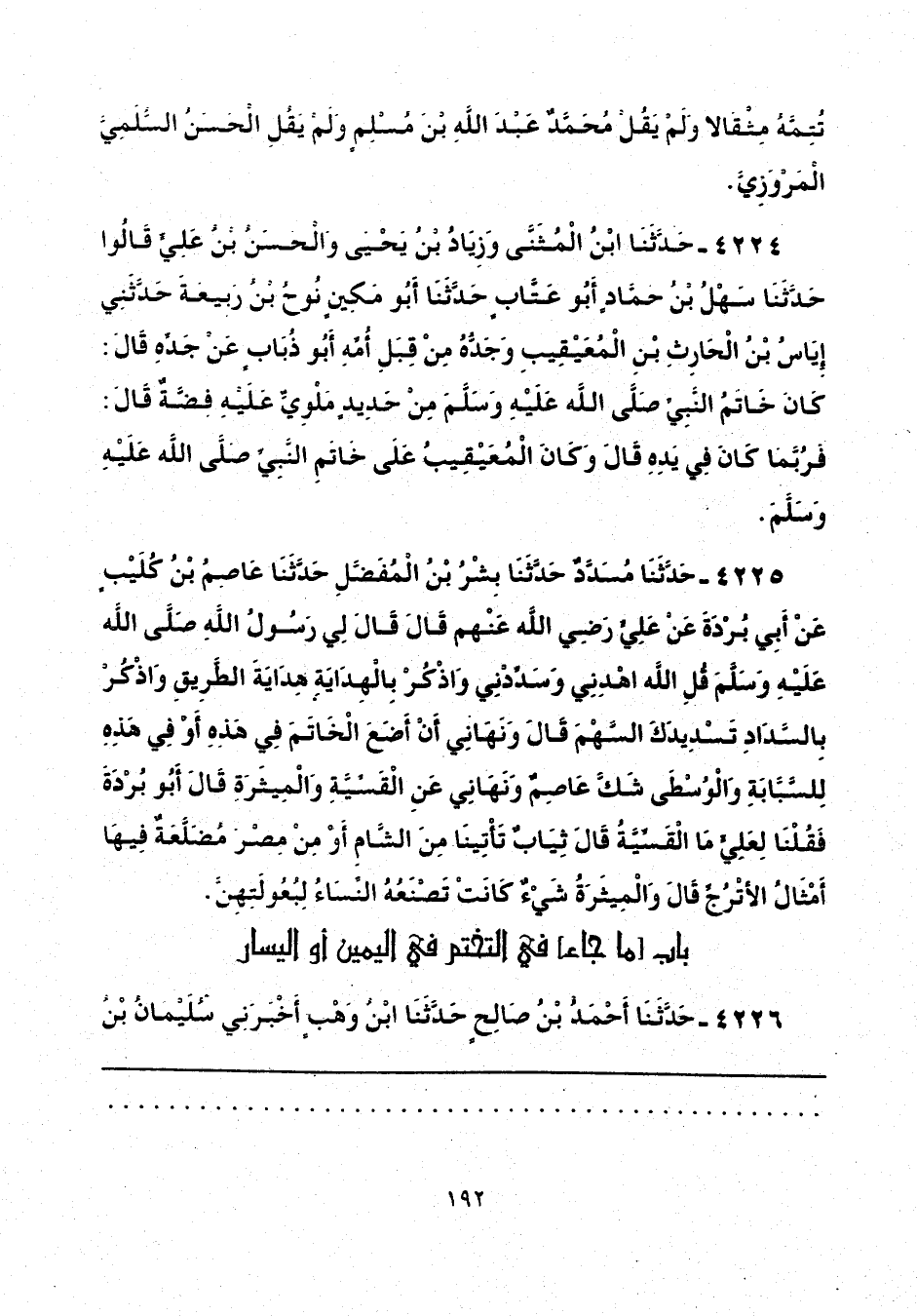 4225 - حَدَّثَنَا مُسَدَّدٌ، حَدَّثَنَا بِشْرُ بْنُ الْمُفَضَّلِ، حَدَّثَنَا عَاصِمُ بْنُ كُلَيْبٍ، عَنْ أَبِي بُرْدَةَ، عَنْ عَلِيٍّ رَضِيَ اللَّهُ عَنْهُ، قَالَ: قَالَ لِي رَسُولُ اللَّهِ صَلَّى اللهُ عَلَيْهِ وَسَلَّمَ: " قُلْ: اللَّهُمَّ اهْدِنِي وَسَدِّدْنِي، وَاذْكُرْ بِالْهِدَايَةِ هِدَايَةَ الطَّرِيقِ، وَاذْكُرْ بِالسَّدَادِ تَسْدِيدَكَ السَّهْمَ "، قَالَ: وَنَهَانِي أَنْ أَضَعَ الْخَاتَمَ فِي هَذِهِ أَوْ فِي هَذِهِ - لِلسَّبَّابَةِ، وَالْوُسْطَى، شَكَّ عَاصِمٌ -، وَنَهَانِي عَنِ القَسِّيَّةِ، وَالْمِيثَرَةِ، قَالَ أَبُو بُرْدَةَ: فَقُلْنَا لِعَلِيٍّ: مَا الْقَسِّيَّةُ؟ قَالَ: «ثِيَابٌ تَأْتِينَا مِنَ الشَّامِ، أَوْ مِنْ مِصْرَ مُضَلَّعَةٌ، فِيهَا أَمْثَالُ الْأُتْرُجِّ»، قَالَ: " وَالْمِيثَرَةُ: شَيْءٌ كَانَتْ تَصْنَعُهُ النِّسَاءُ لِبُعُولَتِهِنَّ.