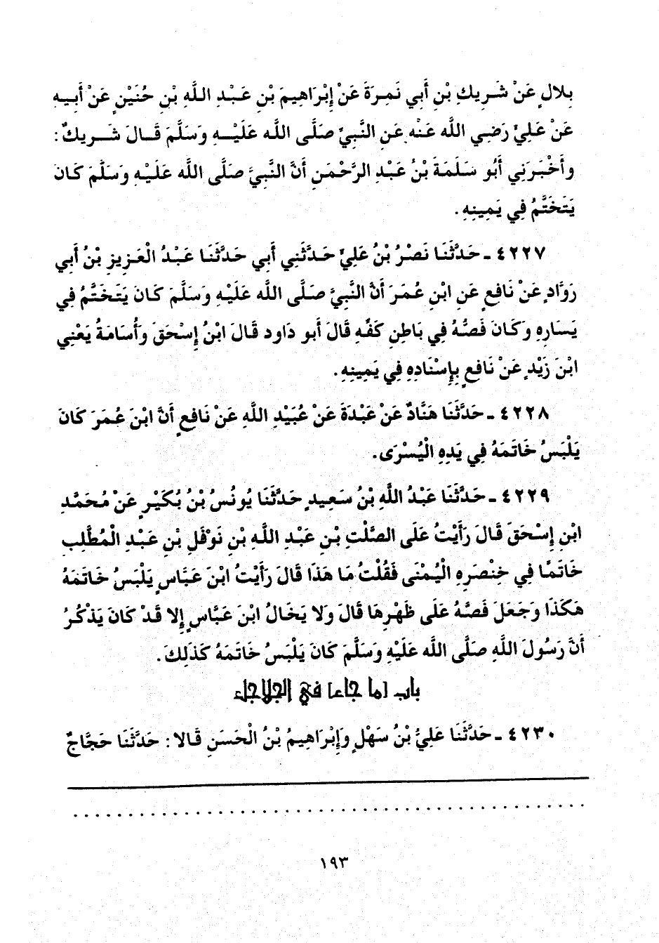 4228 - حَدَّثَنَا هَنَّادٌ، عَنْ عَبْدَةَ، عَنْ عُبَيْدِ اللَّهِ، عَنْ نَافِعٍ، أَنَّ ابْنَ عُمَرَ، «كَانَ يَلْبَسُ خَاتَمَهُ فِي يَدِهِ الْيُسْرَى».
