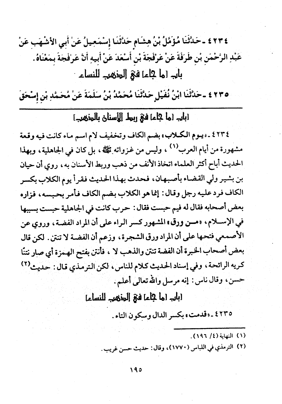 4234 - " يوم الكلاب" بضم الكاف وتخفيف لام اسم ماء كانت فيه وقعة مشهورة من أيام العرب (¬1)، وليس من غزواته - صلى الله عليه وسلم -، بل كان في الجاهلية، وبهذا الحديث أباح أكثر العلماء اتخاذ الأنف من ذهب وربط الأسنان به، روي أن حيان بن بشير ولي القضاء بأصبهان، فحدث بهذا الحديث فقرأ يوم الكلاب بكسر الكاف فرد عليه رجل وقال: إنما هو الكلاب بضم الكاف فأمر بحبسه، فزاره بعض أصحابه فقال له فيم حبست فقال: حرب كانت في الجاهلية حبست بسببها في الإسلام، "من ورق" المشهور كسر الراء على أن المراد الفضة، وروي عن الأصمعي فتحها على أن المراد ورق الشجرة، وزعم أن الفضة لا تنتن. لكن قال بعض أصحاب الخبرة أن الفضة تنتن والذهب لا، فأنتن بفتح الهمزة أي صار نتنًا كريه الرائحة، وفي إسناد الحديث كلام للناس، لكن الترمذي قال: حديث (¬2) حسن، وقال ناس: إنه مرسل والله تعالى أعلم.