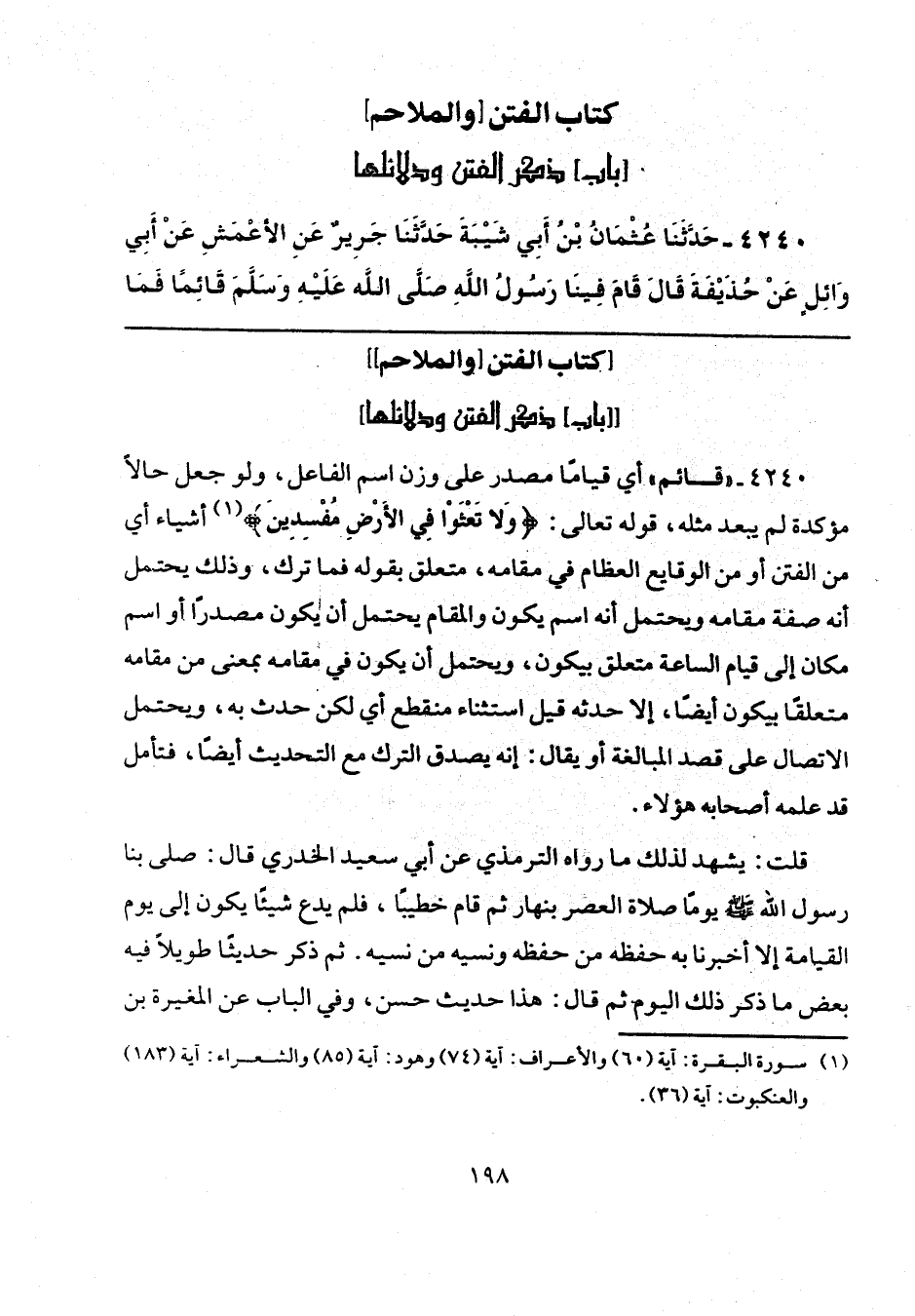 4240 - "قائم" أي قيامًا مصدر على وزن اسم الفاعل، ولو جعل حالًا مؤكدة لم يبعد مثله، قوله تعالى: {وَلَا تَعْثَوْا فِي الْأَرْضِ مُفْسِدِينَ} (¬1) أشياء أي من الفتن أو من الوقايع العظام في مقامه، متعلق بقوله فما ترك، وذلك يحتمل أنه صقة مقامه ويحتمل أنه اسم يكون والمقام يحتمل أن يكون مصدرًا أو اسم مكان إلى قيام الساعة متعلق بيكون، ويحتمل أن يكون في مقامه بمعنى من مقامه متعلقًا بيكون أيضًا، إلا حدثه قيل استثناء منقطع أي لكن حدث به، ويحتمل الاتصال على قصد المبالغة أو يقال: إنه يصدق الترك مع التحديث أيضًا، فتأمل قد علمه أصحابه هؤلاء.