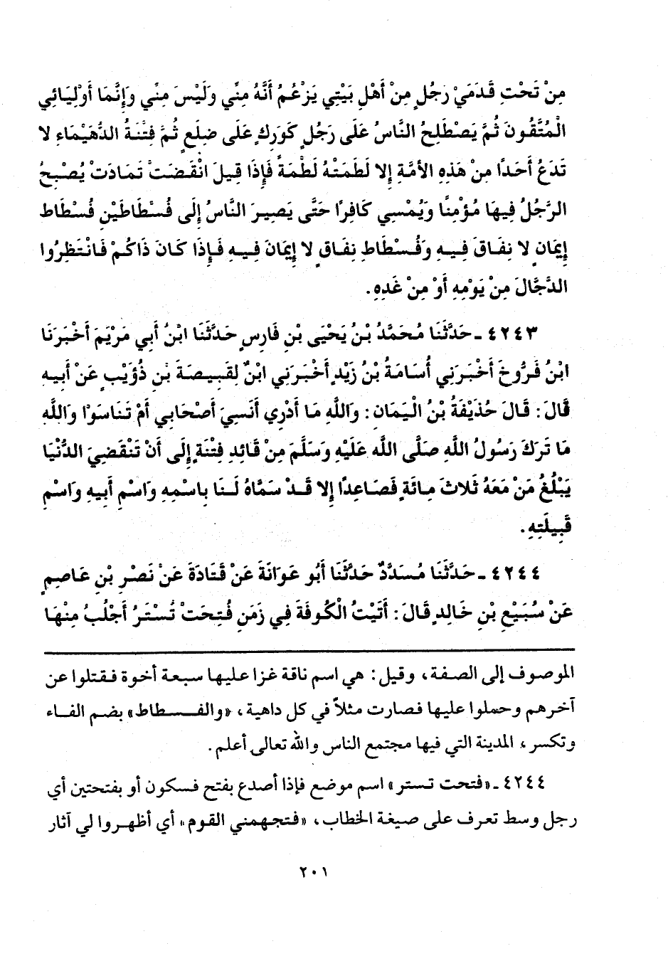 4244 - حَدَّثَنَا مُسَدَّدٌ، حَدَّثَنَا أَبُو عَوَانَةَ، عَنْ قَتَادَةَ، عَنْ نَصْرِ بْنِ عَاصِمٍ، عَنْ سُبَيْعِ بْنِ خَالِدٍ، قَالَ: أَتَيْتُ الْكُوفَةَ فِي زَمَنِ فُتِحَتْ تُسْتَرُ، أَجْلُبُ مِنْهَا