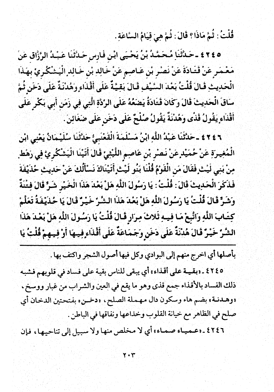 4246 - حَدَّثَنَا عَبْدُ اللَّهِ بْنُ مَسْلَمَةَ الْقَعْنَبِيُّ، حَدَّثَنَا سُلَيْمَانُ يَعْنِي ابْنَ الْمُغِيرَةِ، عَنْ حُمَيْدٍ، عَنْ نَصْرِ بْنِ عَاصِمٍ اللَّيْثِيِّ قَالَ: أَتَيْنَا الْيَشْكُرِيَّ فِي رَهْطٍ مِنْ بَنِي لَيْثٍ، فَقَالَ: مَنِ الْقَوْمُ؟ قُلْنَا: بَنُو لَيْثٍ، أَتَيْنَاكَ نَسْأَلُكَ عَنْ حَدِيثِ حُذَيْفَةَ، فَذَكَرَ الْحَدِيثَ، قَالَ: قُلْتُ: يَا رَسُولَ اللَّهِ، هَلْ بَعْدَ هَذَا الْخَيْرِ شَرٌّ؟ قَالَ: «فِتْنَةٌ وَشَرٌّ»، قَالَ: قُلْتُ: يَا رَسُولَ اللَّهِ، هَلْ بَعْدَ هَذَا الشَّرِّ خَيْرٌ؟ قَالَ: «يَا حُذَيْفَةُ، تَعَلَّمْ كِتَابَ اللَّهِ وَاتَّبِعْ مَا فِيهِ» ثَلَاثَ مِرَارٍ، قَالَ: قُلْتُ: يَا رَسُولَ اللَّهِ، هَلْ بَعْدَ هَذَا الشَّرِّ خَيْرٌ؟ قَالَ: «هُدْنَةٌ عَلَى دَخَنٍ، وَجَمَاعَةٌ عَلَى أَقْذَاءٍ، فِيهَا - أَوْ فِيهِمْ -» قُلْتُ: يَا