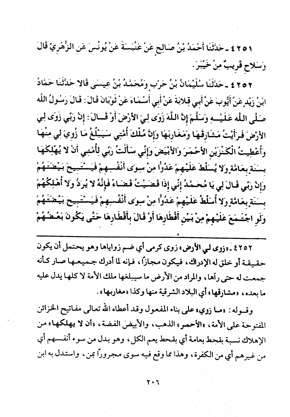 4252 - حَدَّثَنَا سُلَيْمَانُ بْنُ حَرْبٍ، وَمُحَمَّدُ بْنُ عِيسَى، قَالَا: حَدَّثَنَا حَمَّادُ بْنُ زَيْدٍ، عَنْ أَيُّوبَ، عَنْ أَبِي قِلَابَةَ، عَنْ أَبِي أَسْمَاءَ، عَنْ ثَوْبَانَ، قَالَ: قَالَ رَسُولُ اللَّهِ صَلَّى اللهُ عَلَيْهِ وَسَلَّمَ: «إِنَّ اللَّهَ زَوَى لِي الْأَرْضَ» - أَوْ قَالَ: - إِنَّ رَبِّي زَوَى لِي الْأَرْضَ، فَرَأَيْتُ مَشَارِقَهَا وَمَغَارِبَهَا، وَإِنَّ مُلْكَ أُمَّتِي سَيَبْلُغُ مَا زُوِيَ لِي مِنْهَا، وَأُعْطِيتُ الْكَنْزَيْنِ الْأَحْمَرَ وَالْأَبْيَضَ، وَإِنِّي سَأَلْتُ رَبِّي لِأُمَّتِي أَنْ لَا يُهْلِكَهَا بِسَنَةٍ بِعَامَّةٍ، وَلَا يُسَلِّطَ عَلَيْهِمْ عَدُوًّا مِنْ سِوَى أَنْفُسِهِمْ، فَيَسْتَبِيحَ بَيْضَتَهُمْ، وَإِنَّ رَبِّي قَالَ لِي: يَا مُحَمَّدُ، إِنِّي إِذَا قَضَيْتُ قَضَاءً، فَإِنَّهُ لَا يُرَدُّ، وَلَا أُهْلِكُهُمْ بِسَنَةٍ بِعَامَّةٍ، وَلَا أُسَلِّطُ عَلَيْهِمْ عَدُوًّا مِنْ سِوَى أَنْفُسِهِمْ، فَيَسْتَبِيحَ بَيْضَتَهُمْ، وَلَوِ اجْتَمَعَ عَلَيْهِمْ مِنْ بَيْنِ أَقْطَارِهَا - أَوْ قَالَ بِأَقْطَارِهَا - حَتَّى يَكُونَ بَعْضُهُمْ