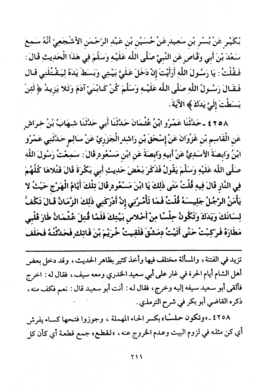 4258 - حَدَّثَنَا عَمْرُو بْنُ عُثْمَانَ، حَدَّثَنَا أَبِي، حَدَّثَنَا شِهَابُ بْنُ خِرَاشٍ، عَنِ الْقَاسِمِ بْنِ غَزْوَانَ، عَنْ إِسْحَاقَ بْنِ رَاشِدٍ الْجَزَرِيِّ، عَنْ سَالِمٍ، حَدَّثَنِي عَمْرُو بْنُ وَابِصَةَ الْأَسَدِيُّ، عَنْ أَبِيهِ وَابِصَةَ، عَنِ ابْنِ مَسْعُودٍ، قَالَ: سَمِعْتُ رَسُولَ اللَّهِ صَلَّى اللهُ عَلَيْهِ وَسَلَّمَ يَقُولُ: فَذَكَرَ بَعْضَ حَدِيثِ أَبِي بَكْرَةَ قَالَ: «قَتْلَاهَا كُلُّهُمْ فِي النَّارِ»، قَالَ فِيهِ: قُلْتُ: مَتَى ذَلِكَ يَا ابْنَ مَسْعُودٍ؟ قَالَ: «تِلْكَ أَيَّامُ الْهَرْجِ حَيْثُ لَا يَأْمَنُ الرَّجُلُ جَلِيسَهُ»، قُلْتُ: فَمَا تَأْمُرُنِي إِنْ أَدْرَكَنِي ذَلِكَ الزَّمَانُ؟ قَالَ: تَكُفُّ لِسَانَكَ وَيَدَكَ، وَتَكُونُ حِلْسًا مِنْ أَحْلَاسِ بَيْتِكَ، فَلَمَّا قُتِلَ عُثْمَانُ طَارَ قَلْبِي مَطَارَهُ، فَرَكِبْتُ حَتَّى أَتَيْتُ دِمَشْقَ، فَلَقِيتُ خُرَيْمَ بْنَ فَاتِكٍ فَحَدَّثْتُهُ، فَحَلَفَ