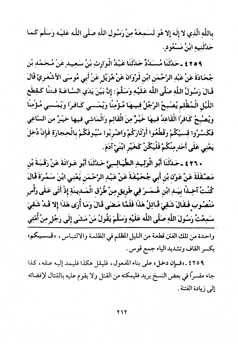 4259 - حَدَّثَنَا مُسَدَّدٌ، حَدَّثَنَا عَبْدُ الْوَارِثِ بْنُ سَعِيدٍ، عَنْ مُحَمَّدِ بْنِ جُحَادَةَ، عَنْ عَبْدِ الرَّحْمَنِ بْنِ ثَرْوَانَ، عَنْ هُزَيْلٍ، عَنْ أَبِي مُوسَى الْأَشْعَرِيِّ، قَالَ: قَالَ رَسُولُ اللَّهِ صَلَّى اللهُ عَلَيْهِ وَسَلَّمَ: «إِنَّ بَيْنَ يَدَيِ السَّاعَةِ فِتَنًا كَقِطَعِ اللَّيْلِ الْمُظْلِمِ، يُصْبِحُ الرَّجُلُ فِيهَا مُؤْمِنًا، وَيُمْسِي كَافِرًا، وَيُمْسِي مُؤْمِنًا، وَيُصْبِحُ كَافِرًا، الْقَاعِدُ فِيهَا خَيْرٌ مِنَ الْقَائِمِ، وَالْمَاشِي فِيهَا خَيْرٌ مِنَ السَّاعِي، فَكَسِّرُوا قِسِيَّكُمْ، وَقَطِّعُوا أَوْتَارَكُمْ، وَاضْرِبُوا سُيُوفَكُمْ بِالْحِجَارَةِ، فَإِنْ دُخِلَ - يَعْنِي - عَلَى أَحَدٍ مِنْكُمْ، فَلْيَكُنْ كَخَيْرِ ابْنَيْ آدَمَ».
