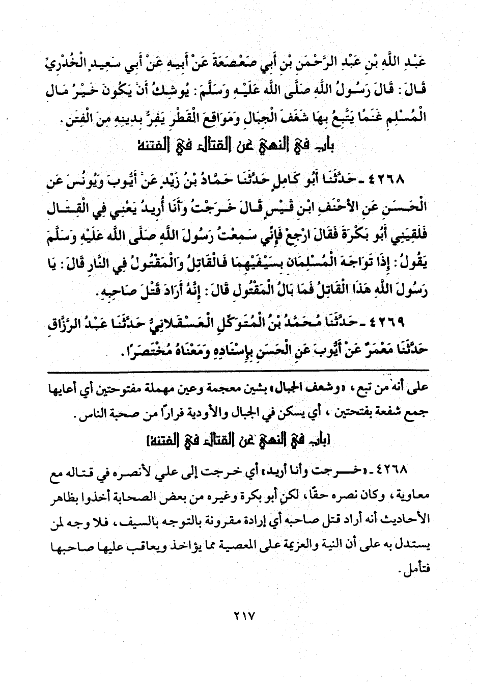 4268 - "خرجت وأنا أريد" أي خرجت إلى علي لأنصره في قتاله مع معاوية، وكان نصره حقًّا، لكن أبو بكرة وغيره من بعض الصحابة أخذوا بظاهر الأحاديث أنه أراد قتل صاحبه أي إرادة مقرونة بالتوجه بالسيف، فلا وجه لمن يستدل به على أن النية والعزيمة على المعصية مما يؤاخذ ويعاقب عليها صاحبها فتأمل.